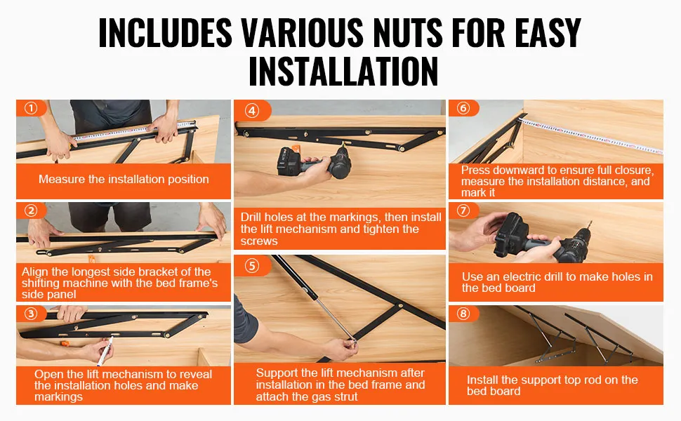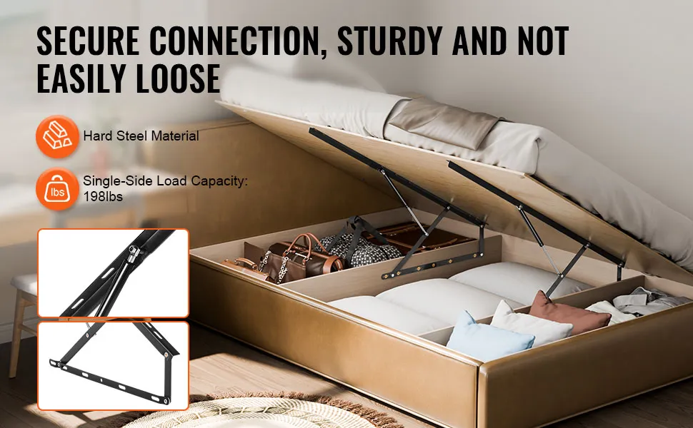 Łatwy w użyciu: Ten podnośnik łóżka wyposażony jest w wysokiej jakości mechanizm sprężyn gazowych, który otwiera i zamyka się bez wysiłku i opóźnień. Nawet po 30 000 cykli otwierania i zamykania, działa płynnie i cicho, co zapewnia długą żywotność.
