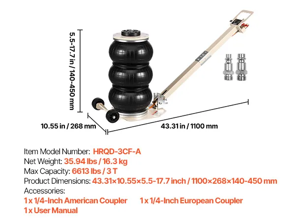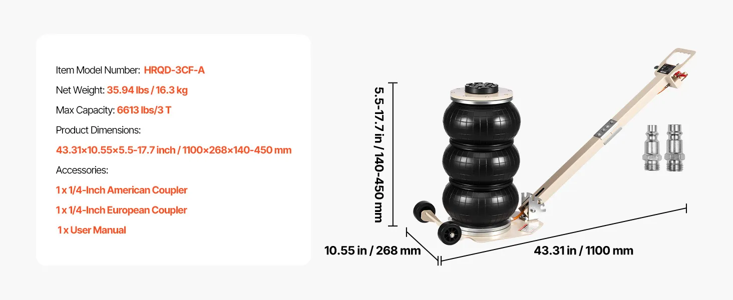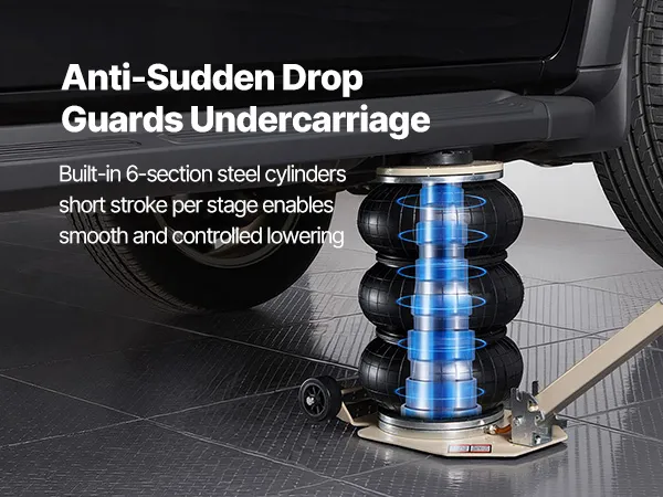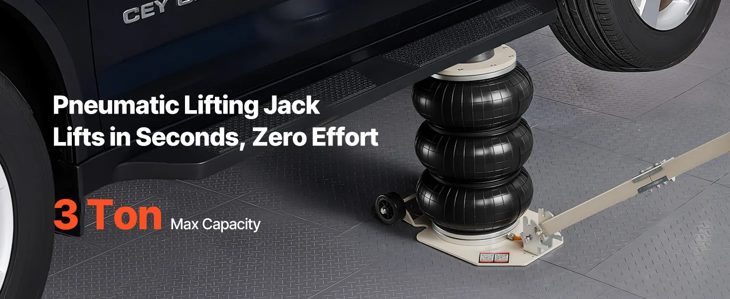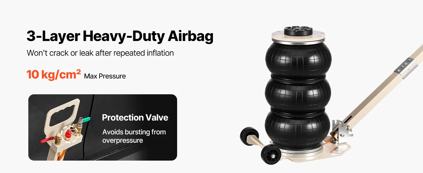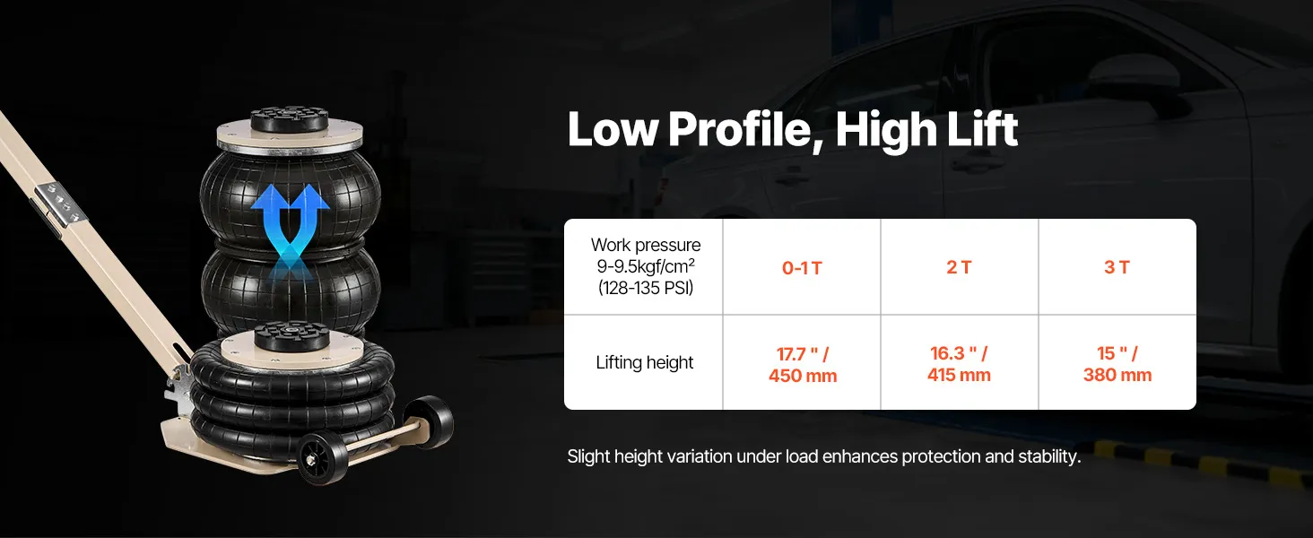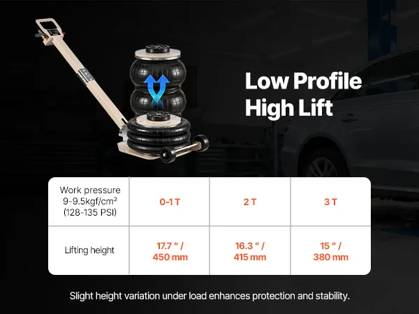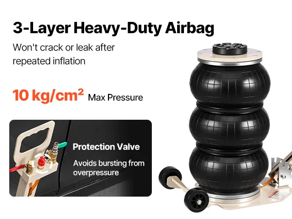 Wysoki udźwig 3 ton: Ten podnośnik pneumatyczny podnosi ciężary do 3 ton (6613 funtów) i nadaje się do sedanów, SUV-ów, pickupów i lekkich ciężarówek. Wzmocnione, trójwarstwowe miechy pneumatyczne i poszerzona płyta podstawy zapewniają mocne i stabilne podnoszenie.