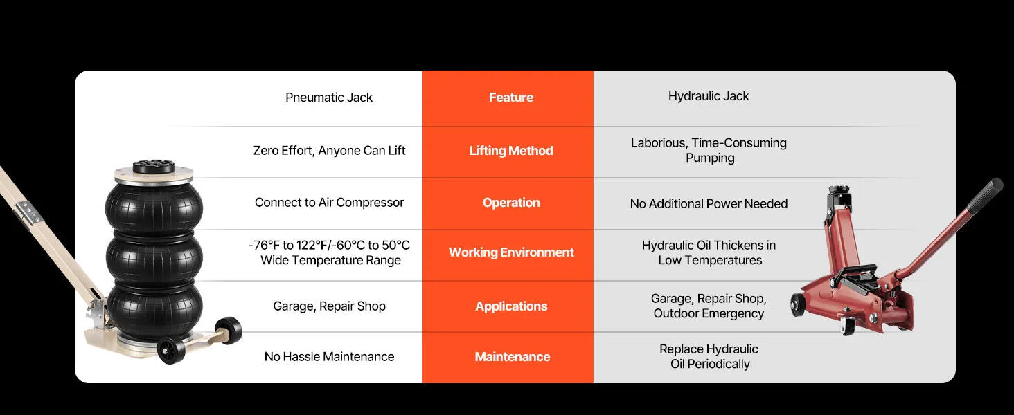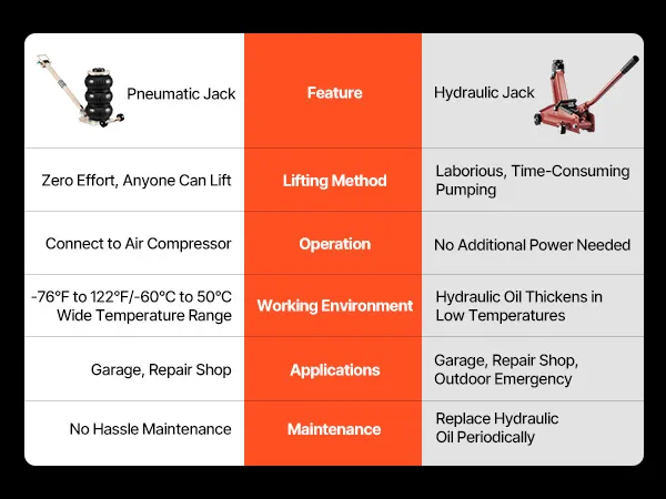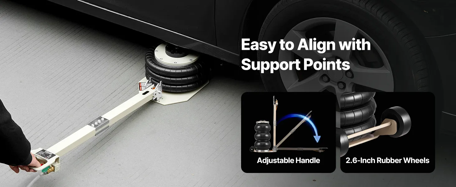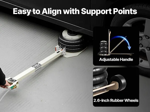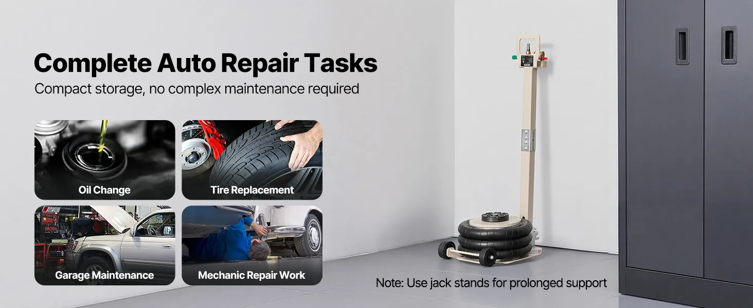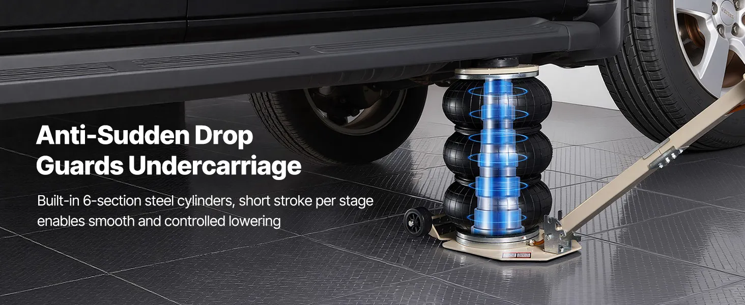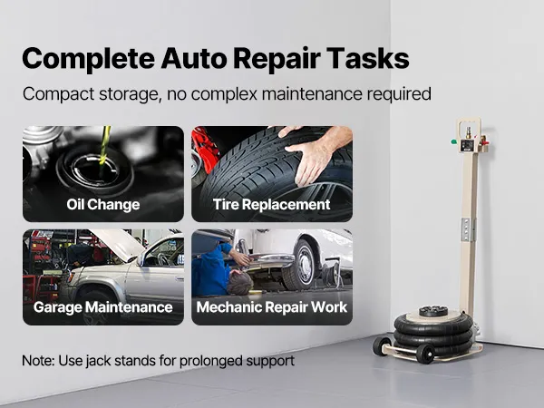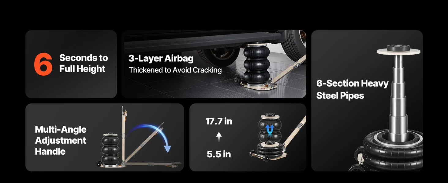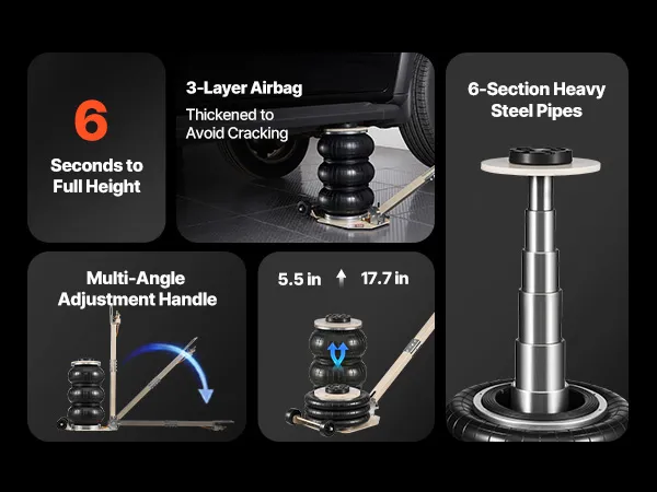 Szybkie podnoszenie w kilka sekund: Podnośnik pneumatyczny podnosi pojazd o 140–450 mm (5,5–17,7 cala) na biegu jałowym. W połączeniu ze sprężarką podnosi samochód w ciągu 1–6 sekund – idealne rozwiązanie do wymiany opon, napraw podwozia i wymiany oleju. Dla większej stabilności należy użyć stojaka podnośnikowego.