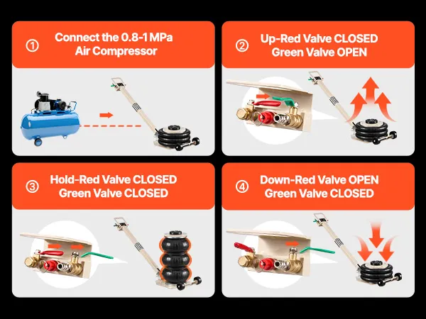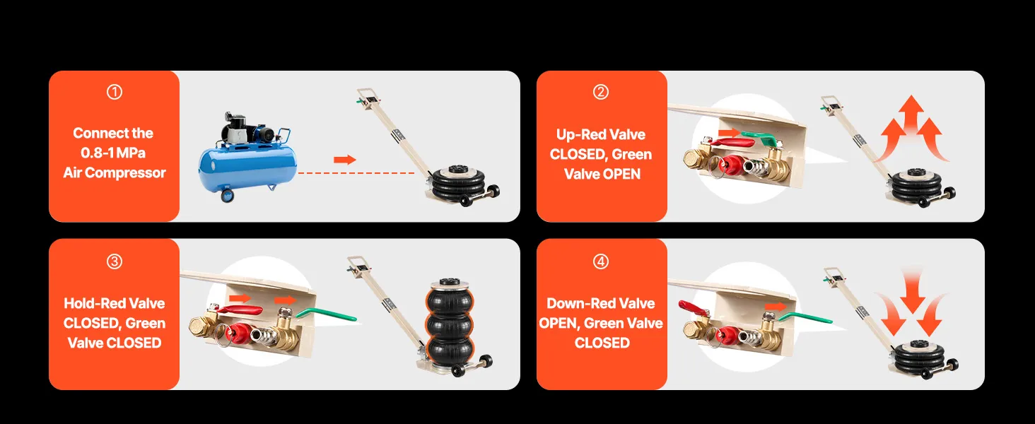 Bezpieczne podparcie pojazdu: Górna część podnośnika pneumatycznego posiada grubą gumową podkładkę, która mocno przylega do punktu styku z pojazdem, zapewniając antypoślizgowy i chroniący podwozie chwyt. Zawór jest wyposażony w złącza 1/4 cala (USA i UE) i jest kompatybilny ze sprężarkami powietrza o ciśnieniu 0,8–1,0 MPa.