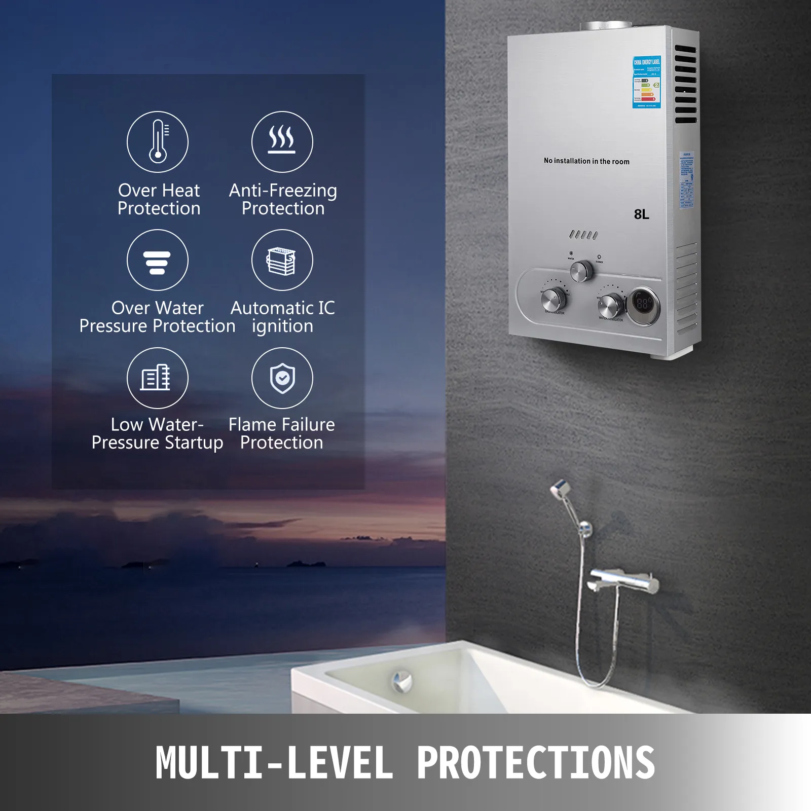 Natychmiastowy gazowy podgrzewacz wody 8L/min, lekki i zajmujący mało miejsca. Konstrukcja naścienna, prysznic w łazience, podczas gdy maszyna jest zainstalowana w kuchni, unikaj ryzyka wycieku toksycznego gazu podczas kąpieli. Przyjdź z zestawem prysznicowym jako prezentem.