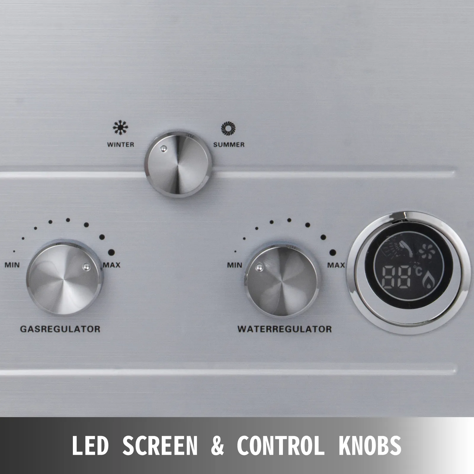 • 【BEZ WYSIŁKU KONTROLA】-Wyczyść wyświetlacz LED aktualnej temperatury wody, obróć pokrętło sterowania dopływem gazu i wylotem wody, aby łatwo dostosować temperaturę ciepłej wody. Ten przepływowy gazowy podgrzewacz wody może również działać w trybie letnim/zimowym w celu oszczędzania energii.