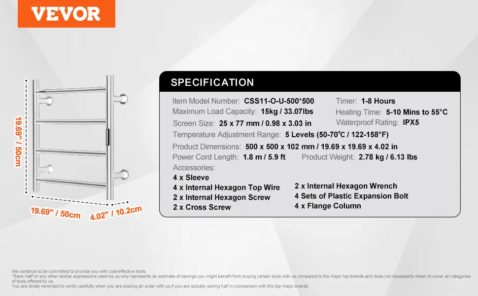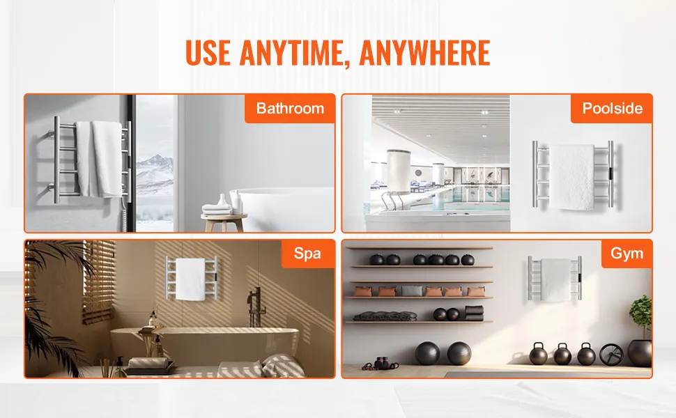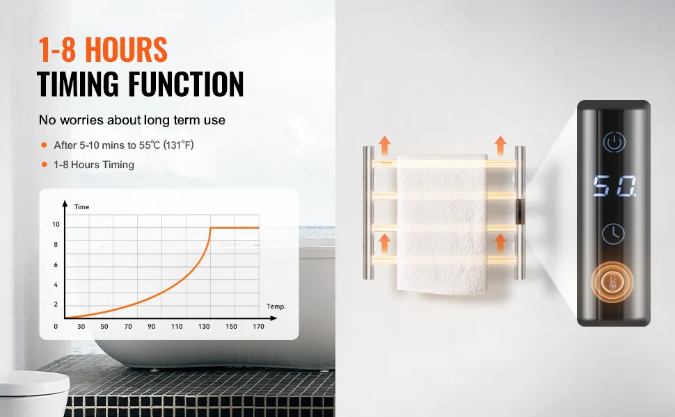 Inteligentny timer: Grzejnik na ręczniki posiada wbudowany timer, który pozwala ustawić czas grzania od 1 do 8 godzin, dostosowując go do Twoich potrzeb. Funkcja ta eliminuje obawy dotyczące bezpieczeństwa podczas długotrwałego użytkowania oraz oszczędza czas i wysiłek.