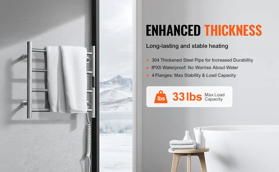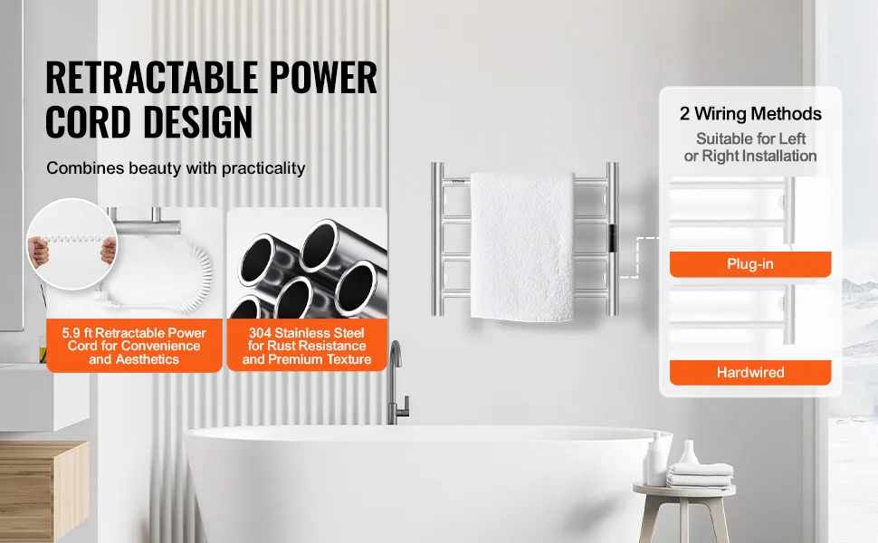 Wysoka jakość: Grubościenny podgrzewacz ręczników jest trwały i równomiernie rozprowadza ciepło. Schludne okablowanie po lewej i prawej stronie podkreśla estetykę produktu i zapewnia schludny wygląd.