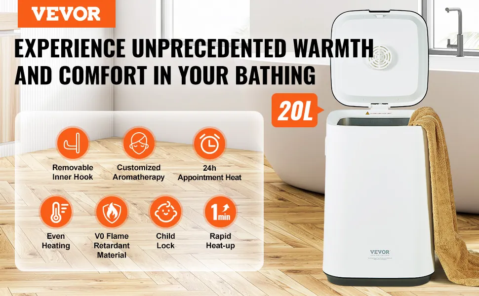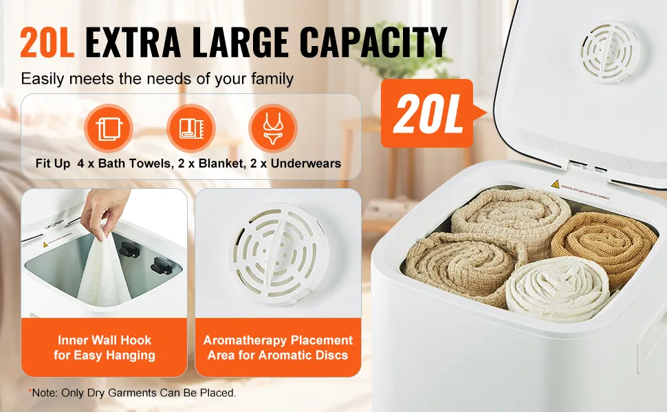 Duża pojemność: Dzięki pojemności 20 litrów, ten duży podgrzewacz ręczników pomieści dwa duże ręczniki kąpielowe (70 x 40 cali / 177,8 x 101,6 cm), szlafroki, koce, piżamy i wiele innych. Alternatywnie, pomieści około pięciu ręczników kąpielowych średniej wielkości. Konstrukcja z wewnętrznym haczykiem ściennym zapewnia wygodne wieszanie i zdejmowanie, a także jest przyjazna dla użytkownika.