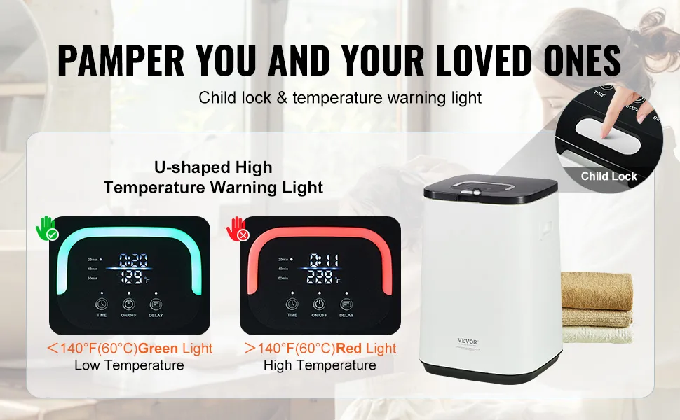 Bezpieczny i ciepły: Podgrzewacz ręczników wyposażony jest w blokadę zabezpieczającą przed dziećmi oraz lampkę kontrolną w kształcie litery U informującą o wysokiej temperaturze. Wykonany jest z materiałów trudnopalnych V0, co zapewnia bezpieczeństwo w domu oraz ciepłe i bezpieczne środowisko.
