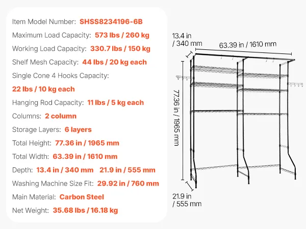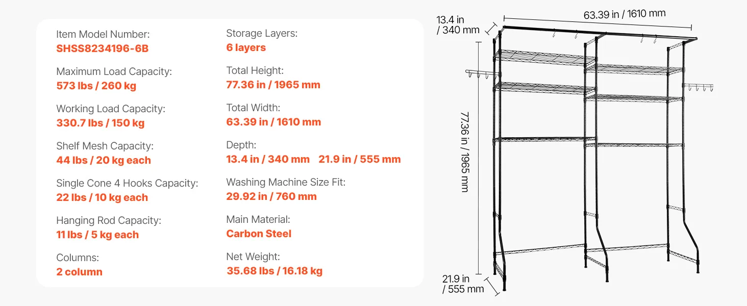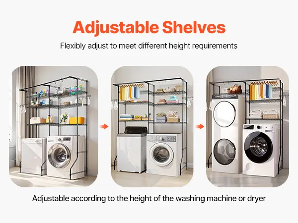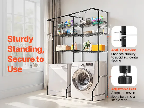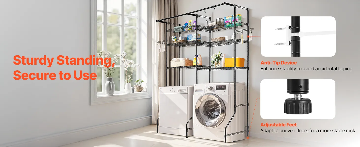 Ten stojak na pralkę i suszarkę z regulowanymi półkami, drążkami i haczykami pasuje do większości pralek. Wykonany jest z trwałej, odpornej na rdzę stali węglowej, wytrzymuje obciążenie do 150 kg, posiada zabezpieczenie antywywrotne i jest łatwy w montażu.
