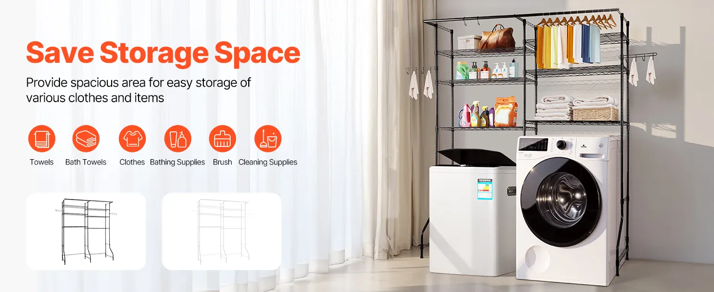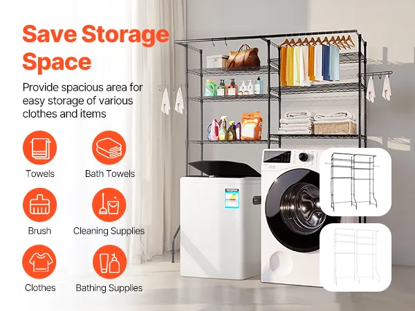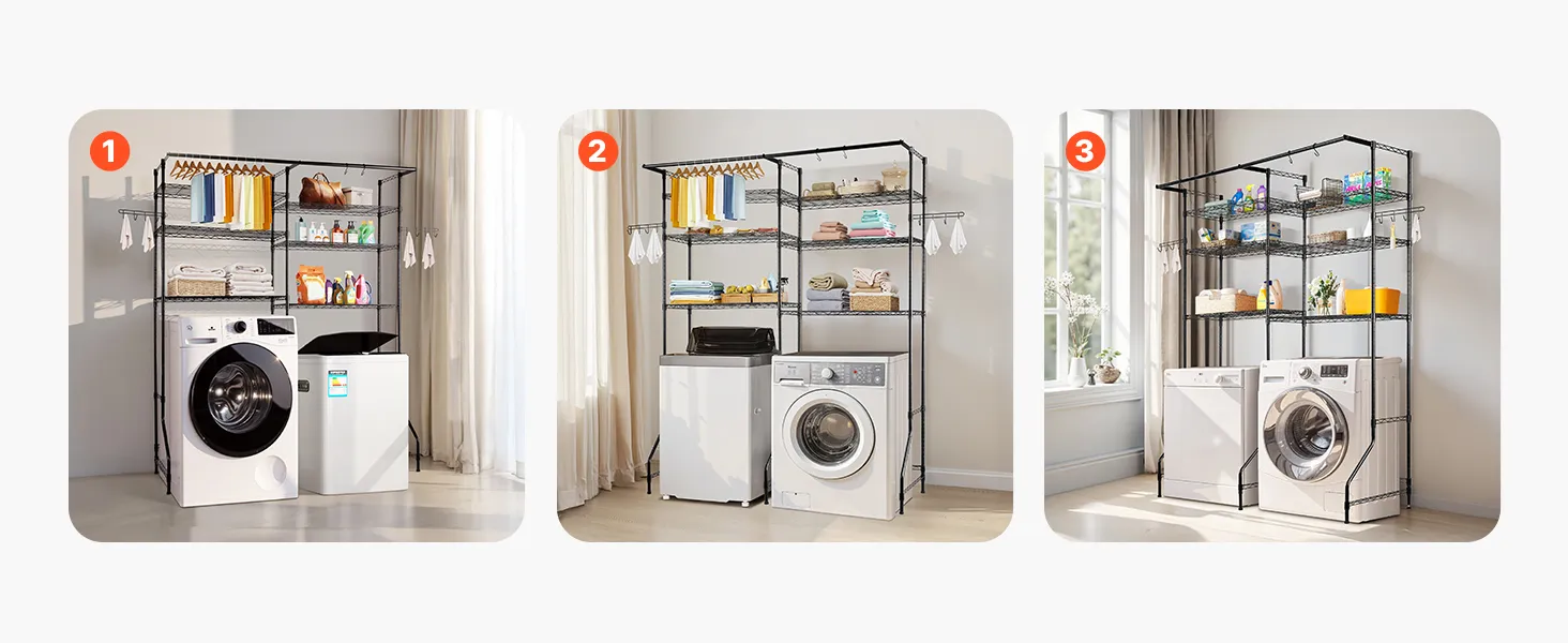 Optymalna przestrzeń do przechowywania: Ten regał nad pralką i suszarką jest wyposażony w metalowe półki, drążki na ubrania i haczyki. Pozwala na łatwe wieszanie lekkich ubrań, ręczników lub środków czyszczących. Kompaktowa konstrukcja pasuje do większości pralek i suszarek o szerokości do 30,5 cala (77,47 cm), dzięki czemu idealnie nadaje się do małych i dużych pralni