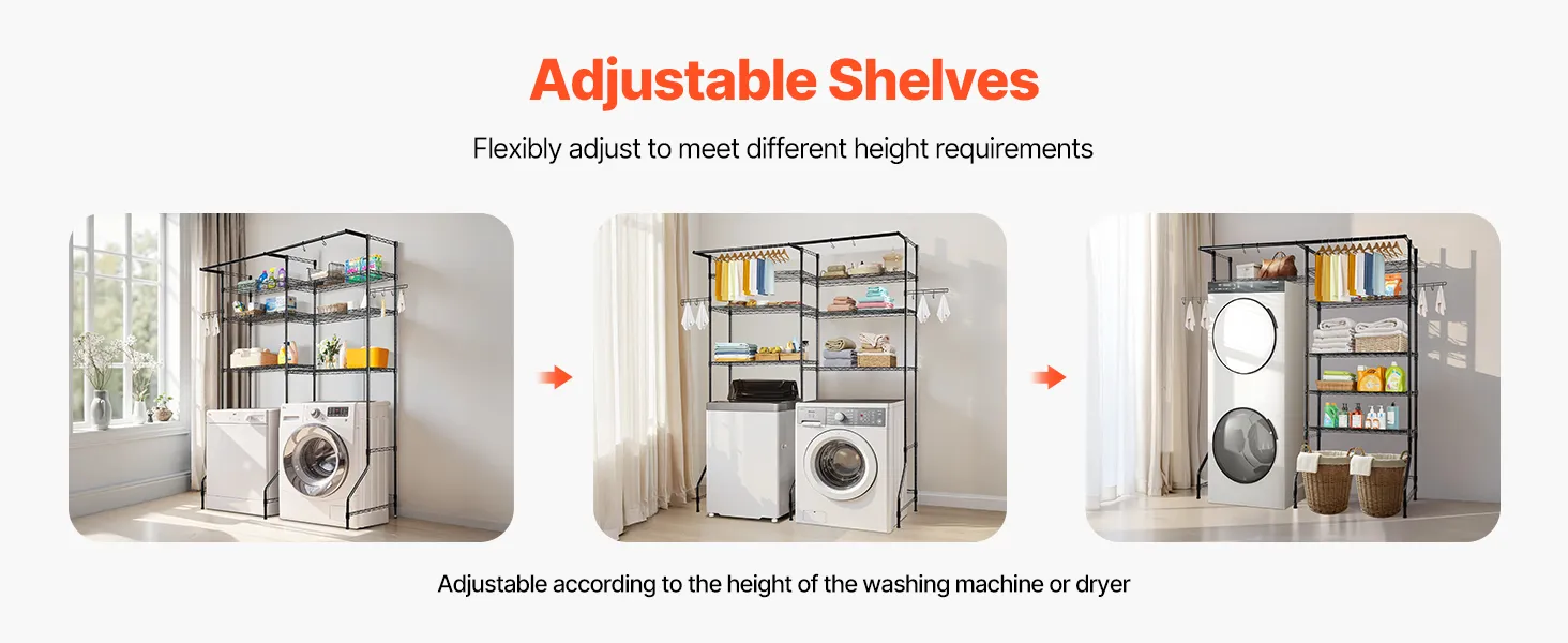 VEVOR Stojak na pralkę i suszarkę, 6-poziomowy stojak na ubrania z drążkiem i haczykami, dwupoziomowe, regulowane półki na pralkę do przechowywania i organizacji, czarny