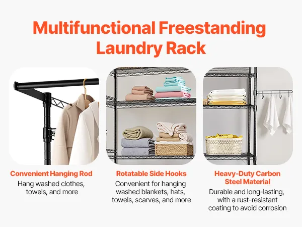 Regulowane półki i nóżki: Dzięki regulowanej wysokości półek możesz zaaranżować przestrzeń do przechowywania ubrań w tym stojaku na pranie według swoich potrzeb. Dodatkowo regulowane nóżki poziomujące zapewniają stabilność na nierównych podłogach i utrzymują półkę stabilną w każdym otoczeniu