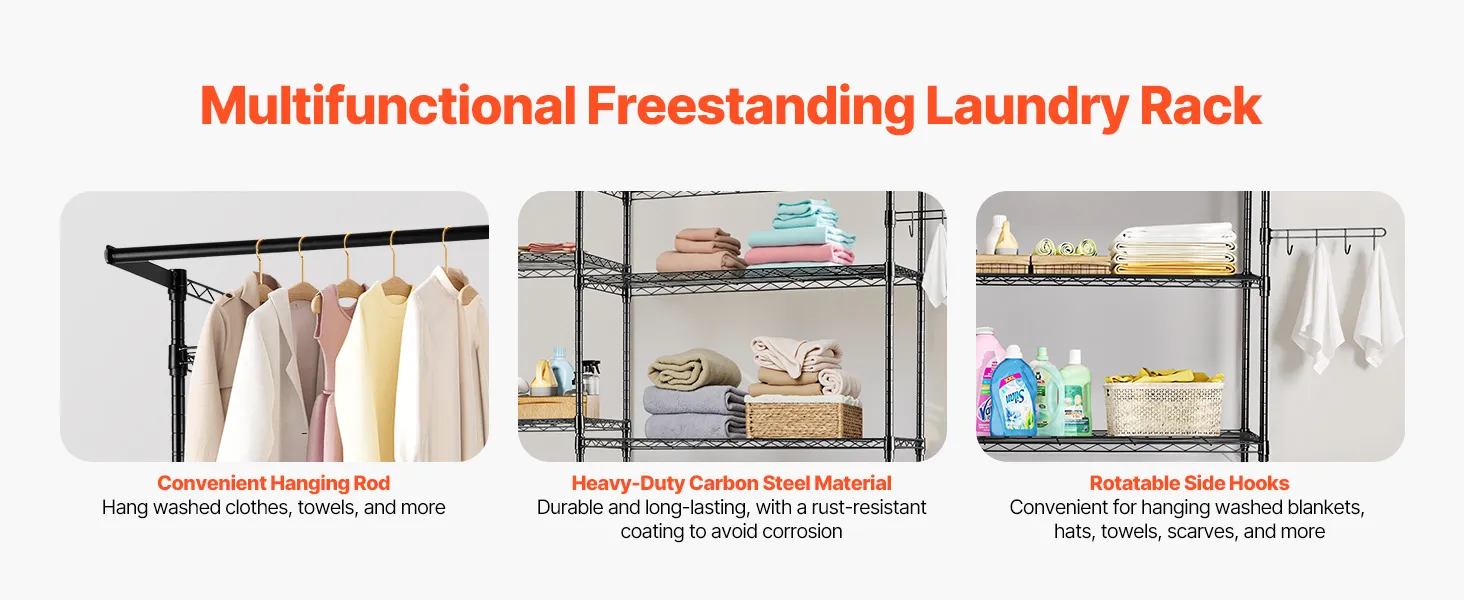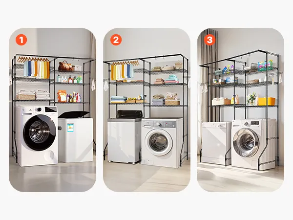 Ten stojak na pralkę i suszarkę łączy w sobie drążek na ubrania, regulowane półki i obrotowe haczyki, aby sprostać różnorodnym potrzebom związanym z przechowywaniem.