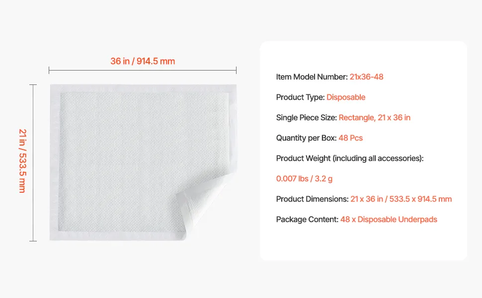 Jednorazowe wkładki chłonne VEVOR na nietrzymanie moczu 533,5 x 914,5 mm, chłonne wkładki z 5-warstwową ochroną do łóżka, sofy i materaca, dla zwierząt domowych, dorosłych, dzieci i seniorów (opakowanie 48 szt.)