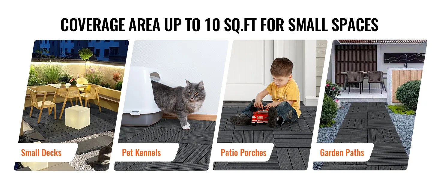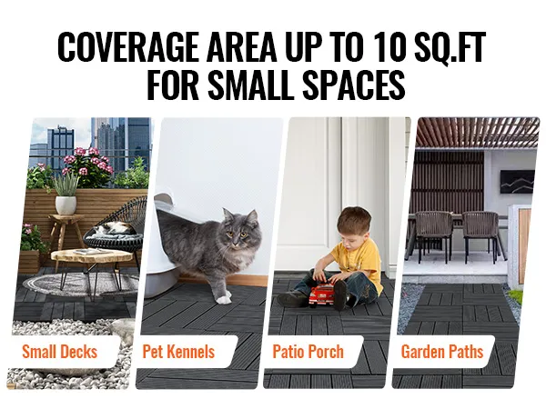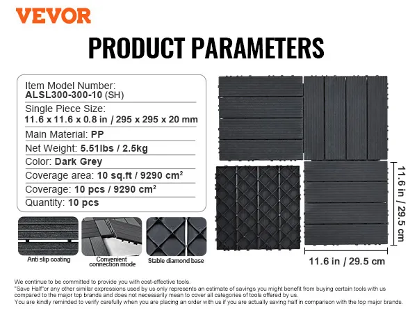 Powierzchnia pokrycia 9290 cm² / 10 stóp kwadratowych: Każdy zestaw zawiera 10 płytek o wymiarach 300 x 300 mm / 11,8 x 11,8 cala, idealnych na tarasy, werandy, prysznice i obszary dla zwierząt.