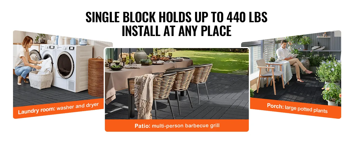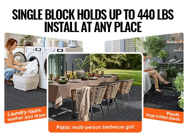 Nośność 440 funtów / 200 kg: Grubość płyt tarasowych wynosi 0,8 cala / 20 mm, dzięki czemu z łatwością utrzymają się na nich ciężkie przedmioty, takie jak ciężarówki, wanny, sofy, pralki i grille.