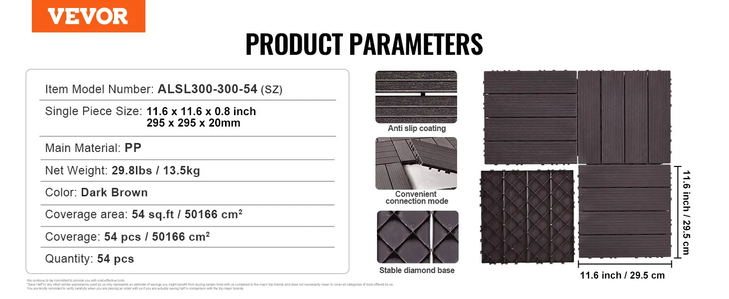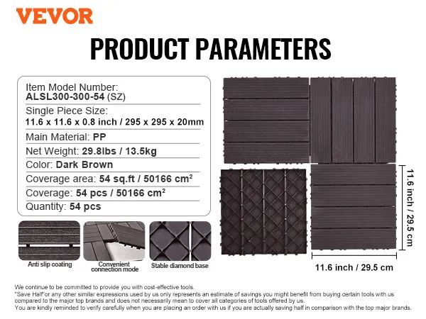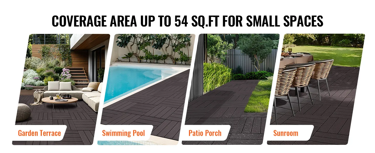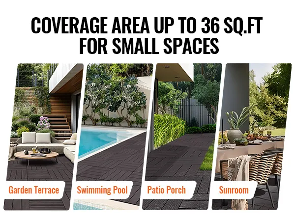 Powierzchnia pokrycia 54 stóp kwadratowych / 50166 cm²: Każdy zestaw zawiera 56 płytek o wymiarach 11,6 x 11,6 cala / 295 x 295 mm, idealnych do pokrycia dużych tarasów na świeżym powietrzu, werand, basenów lub wewnętrznych pryszniców i pralni.