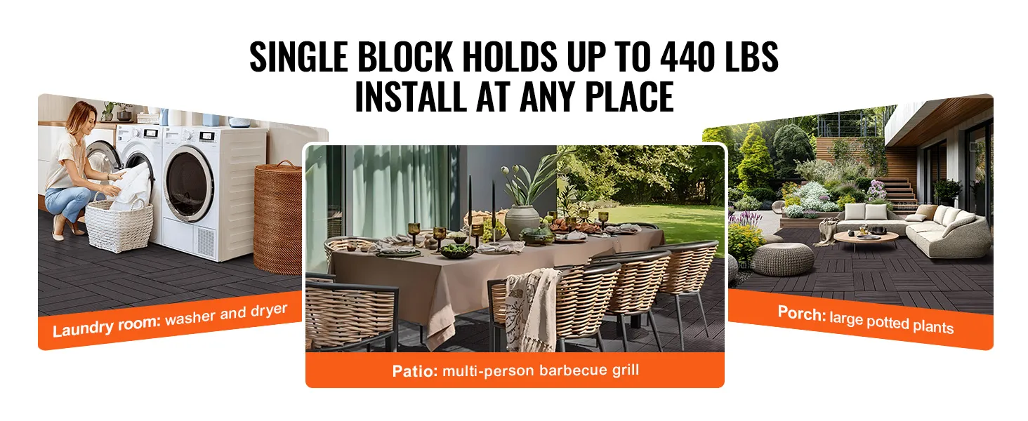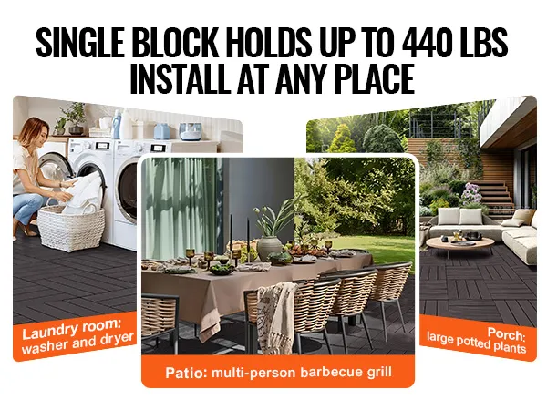 Nośność 440 funtów / 200 kg: Grubość płyt tarasowych wynosi 0,8 cala / 20 mm, dzięki czemu z łatwością utrzymają się na nich ciężkie przedmioty, takie jak ciężarówki, wanny, sofy, pralki i grille.
