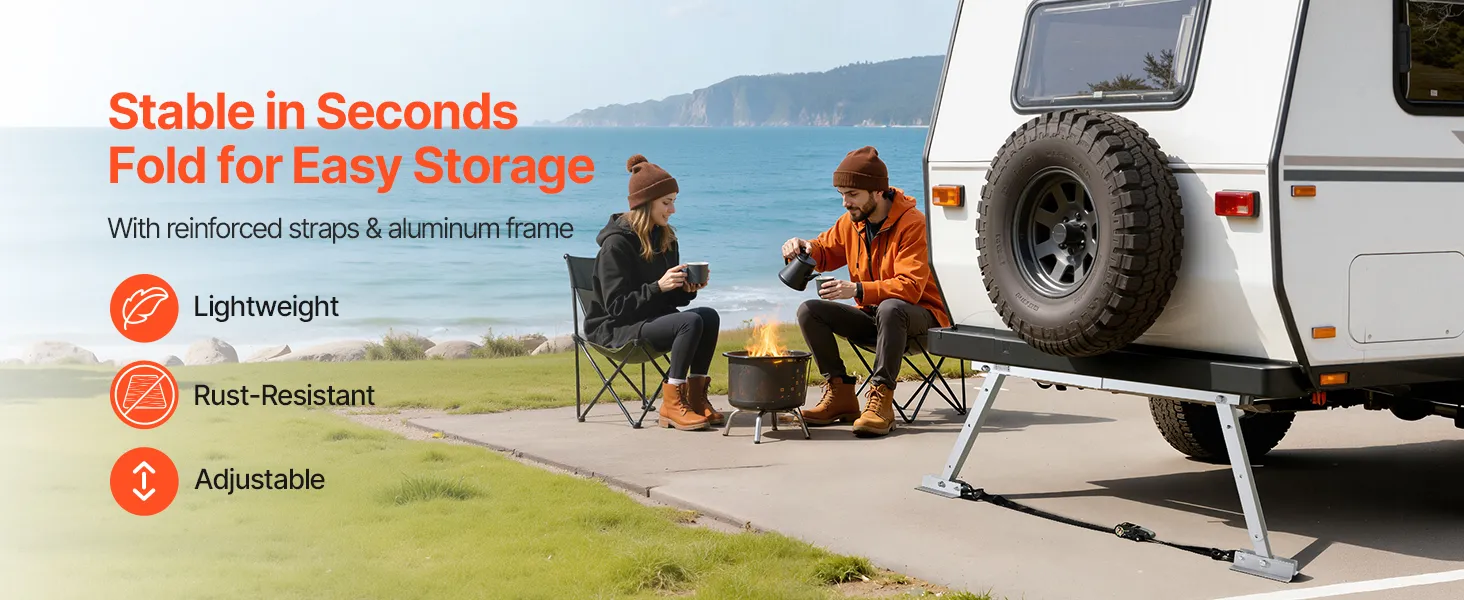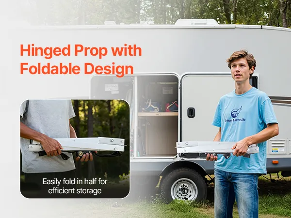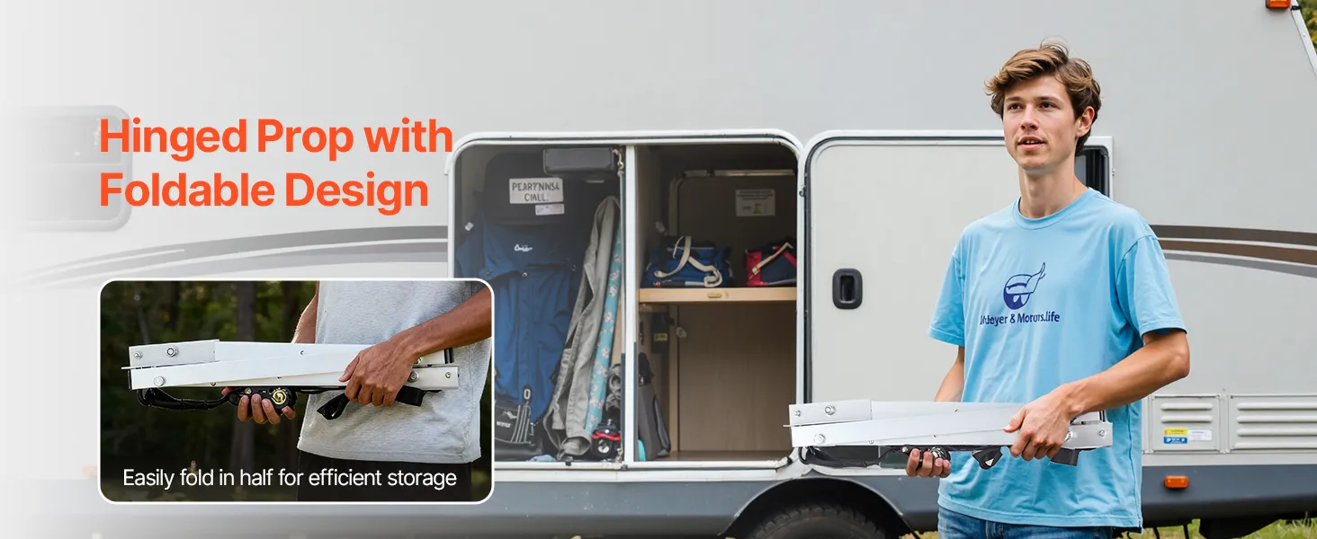 Kompaktowy i składany: Słupek podporowy jest składany, dzięki czemu zajmuje bardzo mało miejsca. To idealne rozwiązanie do łatwego transportu podczas kolejnej podróży. Można go łatwo przechowywać w schowku lub skrzynce narzędziowej kampera.
