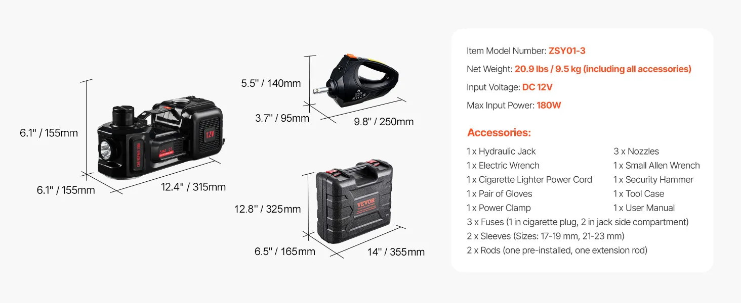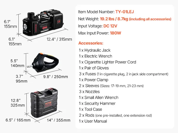 Podwójne zasilanie: Wyposażony w gniazdo zapalniczki samochodowej i gniazdo zasilania samochodowego 12 V, co zapewnia elastyczne opcje zasilania. W przypadku pojazdów powyżej 5 ton zalecamy korzystanie z zasilania samochodowego, aby zapewnić stabilne podnoszenie. W zestawie znajdują się dwa zapasowe bezpieczniki, zapobiegające przepaleniu.