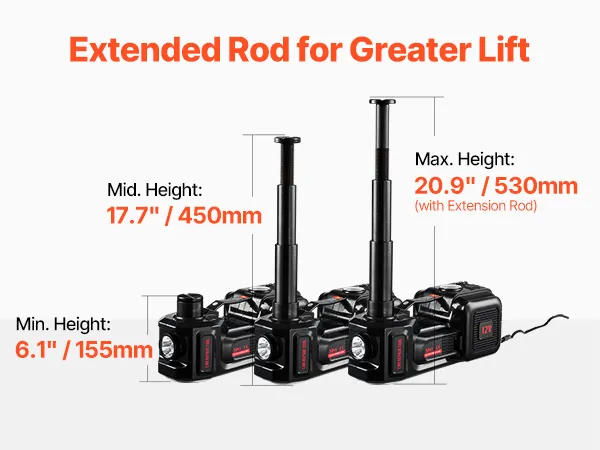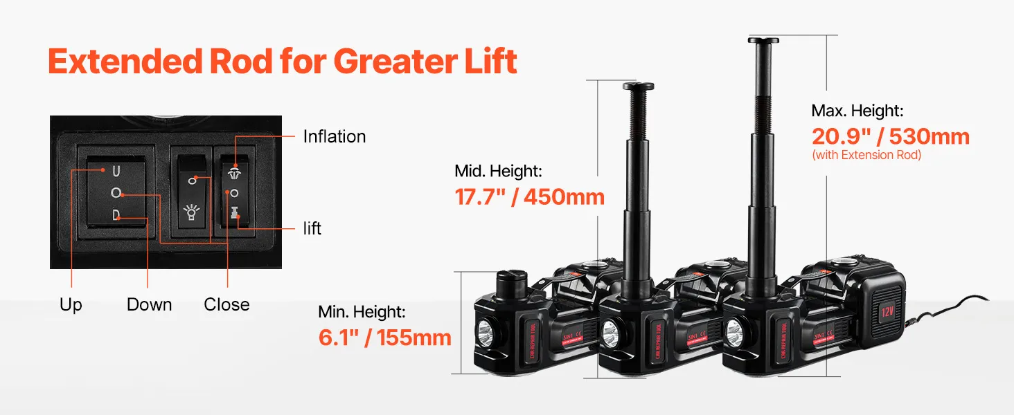 Odpowiedni dla pojazdów 5-tonowych: Zaprojektowany do podnoszenia pojedynczych opon w pojazdach 5-tonowych. Zakres podnoszenia hydraulicznego: 6,1–17,7 cala (155–450 mm) (krótki drążek), 9,2–20,9 cala (235–530 mm) (wydłużony drążek), odpowiedni do samochodów osobowych, SUV-ów i pojazdów o różnym prześwicie. Uwaga: Podnośnik musi być używany na równej powierzchni i ustawiony prostopadle do pojazdu.
