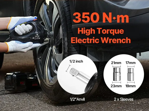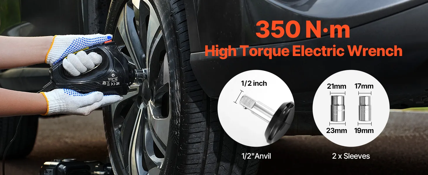 Wydajny klucz elektryczny: Dzięki maksymalnemu momentowi obrotowemu 350 Nm, ten klucz elektryczny dokręca lub odkręca śruby w kilka sekund. Zawiera dwa gniazda imbusowe, kompatybilne z czterema rozmiarami śrub (17/19 mm i 21/23 mm) i pasuje do większości nakrętek kół.