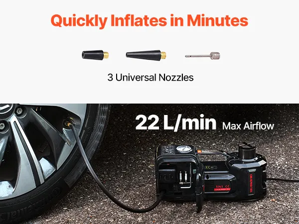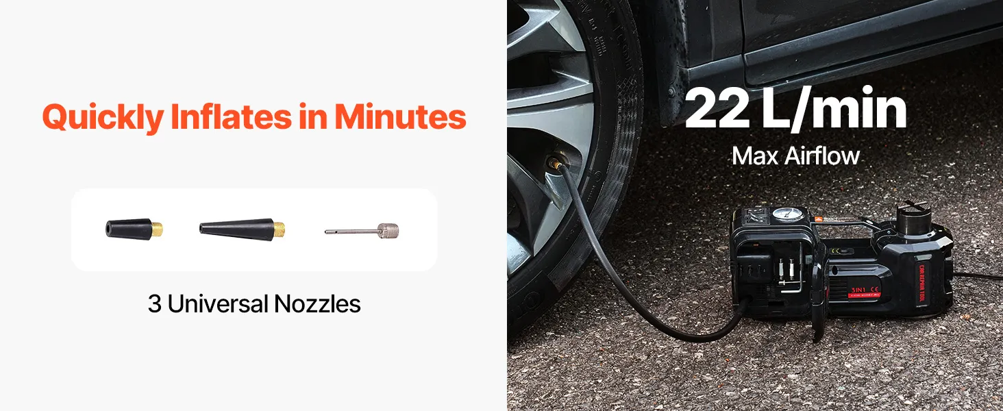 Połączenie pompowania i podnoszenia: Nasz podnośnik elektryczny łączy w sobie funkcje pompowania i podnoszenia opon oraz posiada trzy standardowe dysze, które umożliwiają pompowanie opon w kilka minut. Podnośnik hydrauliczny zwiększa wydajność wymiany opon.