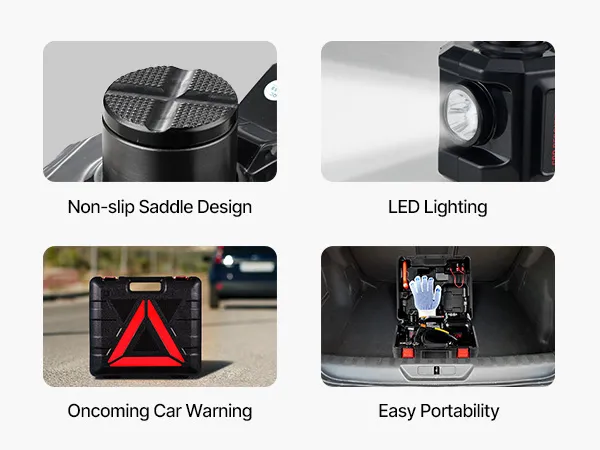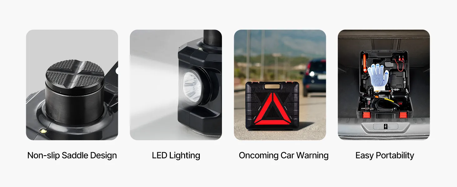 Wyraźne oznakowanie i oświetlenie LED: Ten podnośnik elektryczny jest wyposażony w jasne oświetlenie LED, zapewniające oświetlenie awaryjne i bezpieczną wymianę opon w nocy. Skrzynka narzędziowa jest oznaczona czerwonym trójkątem odblaskowym, co zapewnia widoczność pojazdu.