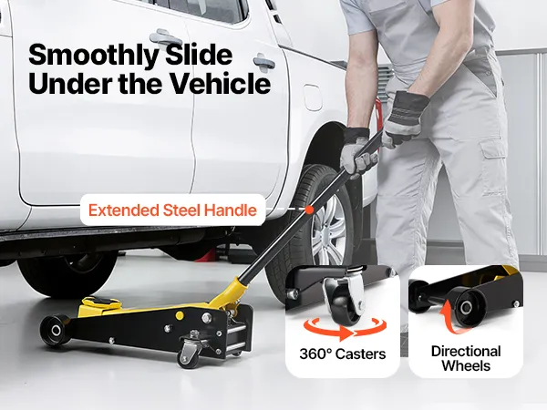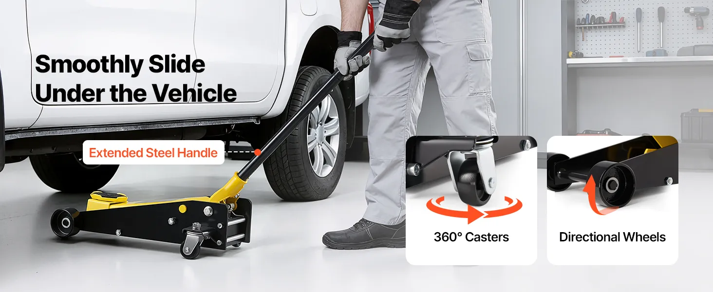 • Pełna mobilność 360°: Ten niskoprofilowy podnośnik wyposażony jest w przedłużoną rączkę dla lepszej kontroli. Dwa kółka obrotowe i dwa koła stałe zapewniają płynne toczenie po asfalcie i umożliwiają łatwe ustawienie pod pojazdem.