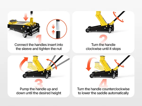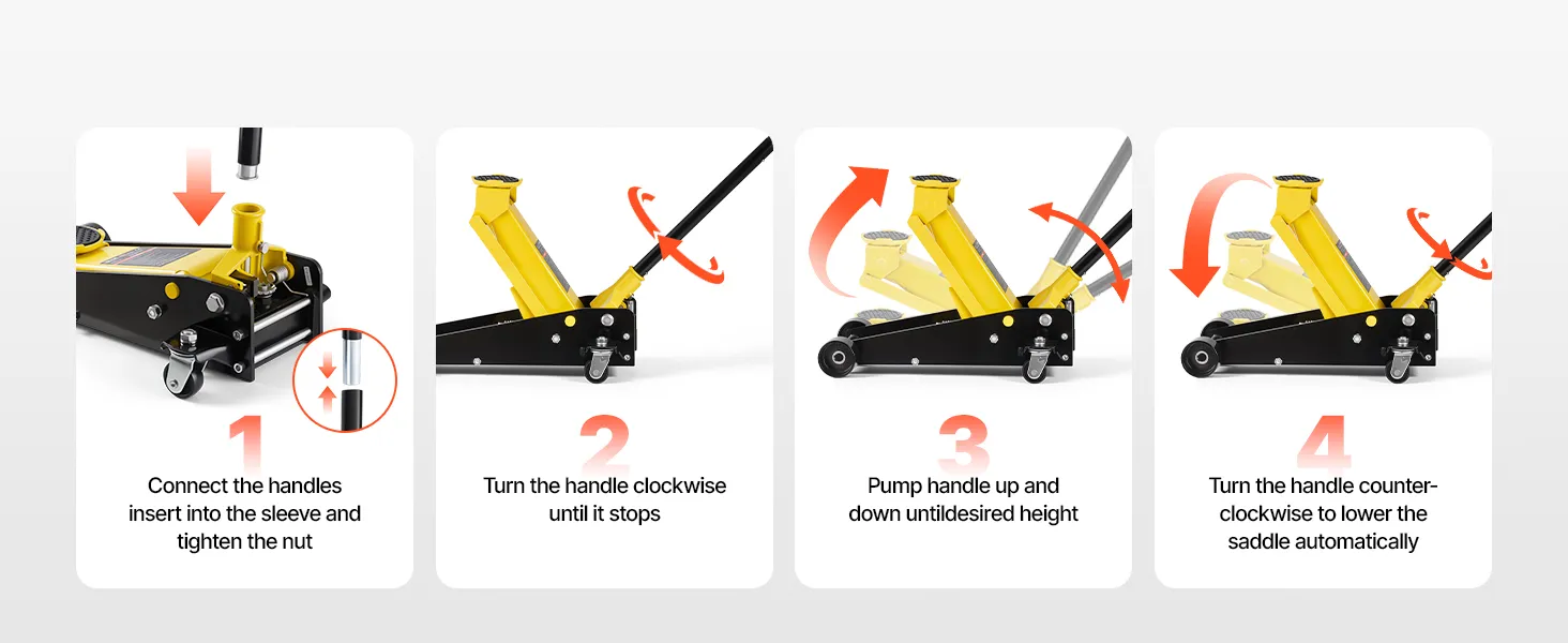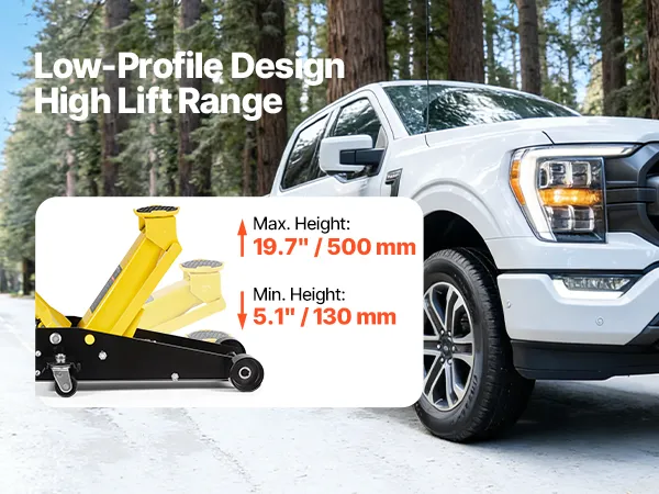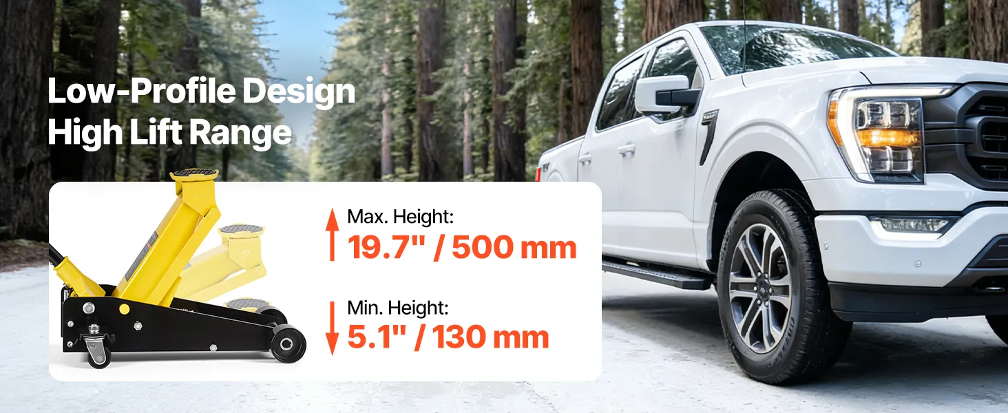 • Duży zakres podnoszenia: Ten podnośnik podnosi pojazdy na wysokość od 130 do 500 mm / 5,1–19,7 cala. Jego płaska konstrukcja pozwala na łatwe wsuwanie pod samochody, zapewniając jednocześnie dużą wysokość podnoszenia. Aby podnieść, dokręć zawór spustowy i pompuj, a następnie obróć uchwyt w kierunku przeciwnym do ruchu wskazówek zegara, aby delikatnie opuścić pojazd.