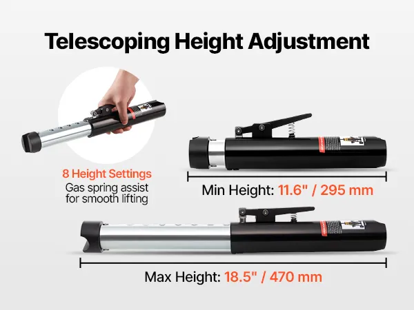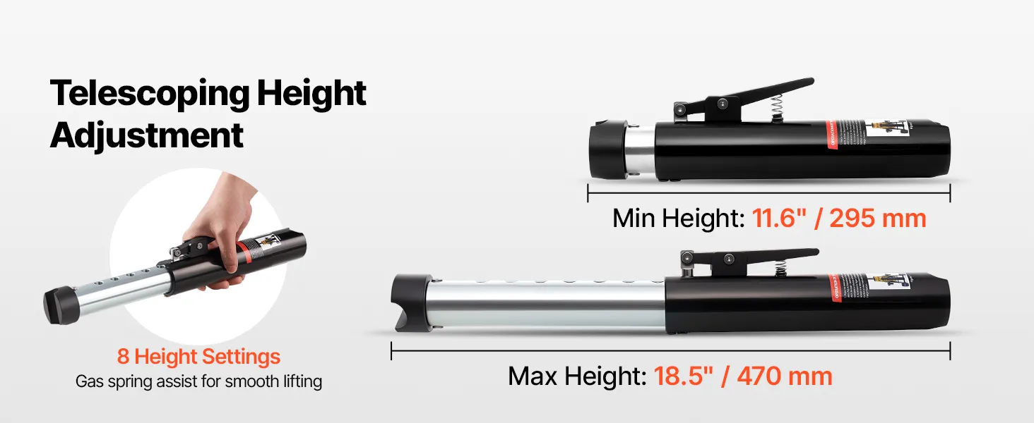 • Zestaw podnośnika i belki podporowej: Nasz podnośnik niskoprofilowy wyposażony jest w teleskopową belkę podporową z 8 ustawieniami wysokości (295–470 mm / 11,6–18,5 cala). Służy on również jako podpora osi i zabezpiecza podnośnik na ustawionej wysokości, umożliwiając bezpieczną pracę pod pojazdem.