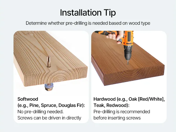 A2: W przypadku drewna miękkiego (np. sosny, świerku, daglezji) wkręty można stosować bezpośrednio. W przypadku drewna twardego (np. dębu (czerwono-białego), teku, sekwoi) wymagane jest wstępne nawiercenie. Produkt nadaje się również do montażu w ścianach betonowych, murowanych i ceglanych.