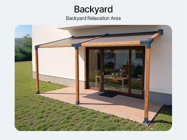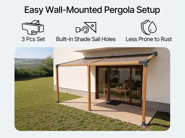 A1: Zestaw zawiera kątową, 4-kierunkową podstawę wsporczą, podstawę słupka do montażu w podłożu oraz wspornik ścienny. Nadaje się do budowy parterowej pergoli ze spadzistym dachem.