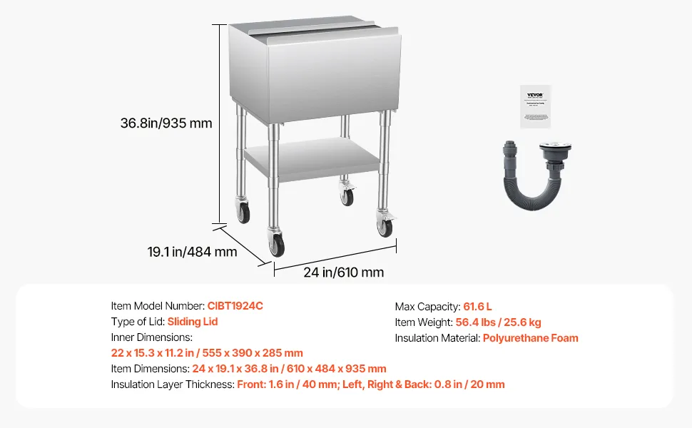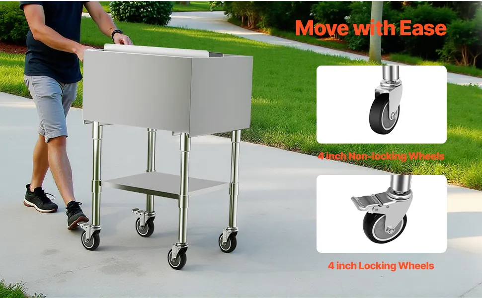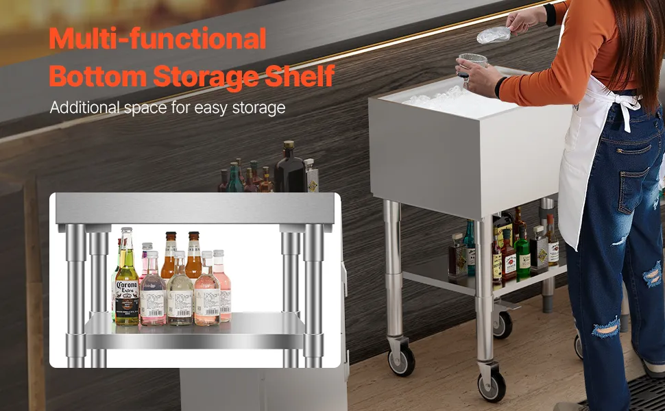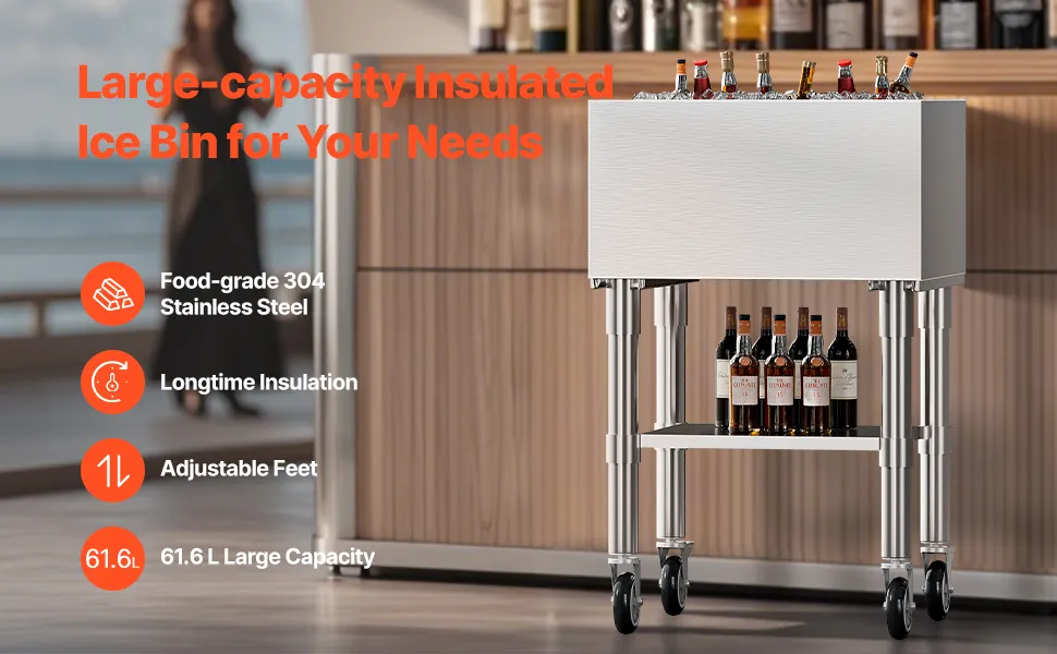 Pojemnik na lód VEVOR Commercial 61,6 l, wózek chłodniczy na kółkach (610 x 484 x 935 mm), stal nierdzewna, z przesuwaną pokrywą, dolnym schowkiem, regulowanymi stopkami kulkowymi, do baru i restauracji