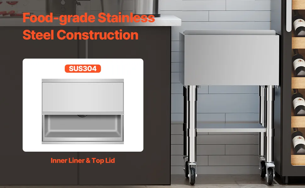Nasz pojemnik na lód pod blatem wykonany jest ze stali nierdzewnej 304 dopuszczonej do kontaktu z żywnością. Wewnętrzna wyściółka i pokrywa wykonane są ze stali nierdzewnej 304, co zapewnia trwałość i bezpieczeństwo. Certyfikat NSF dla Twojego spokoju ducha.