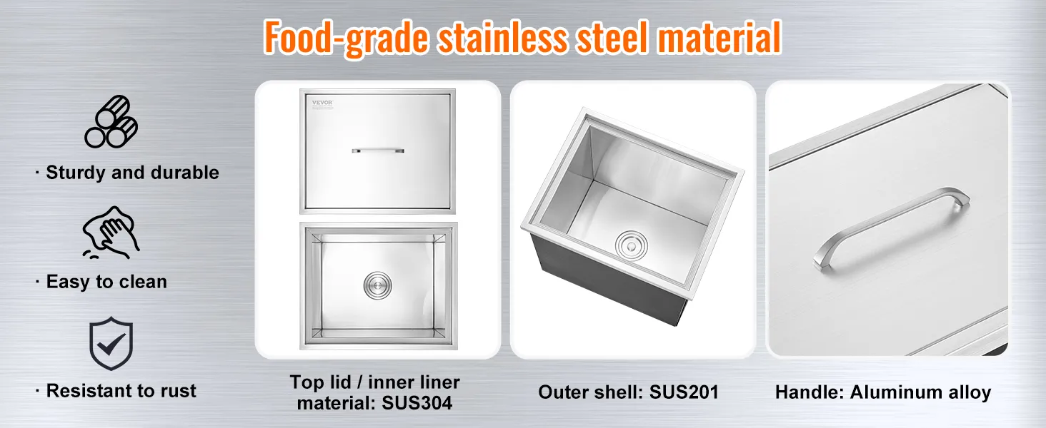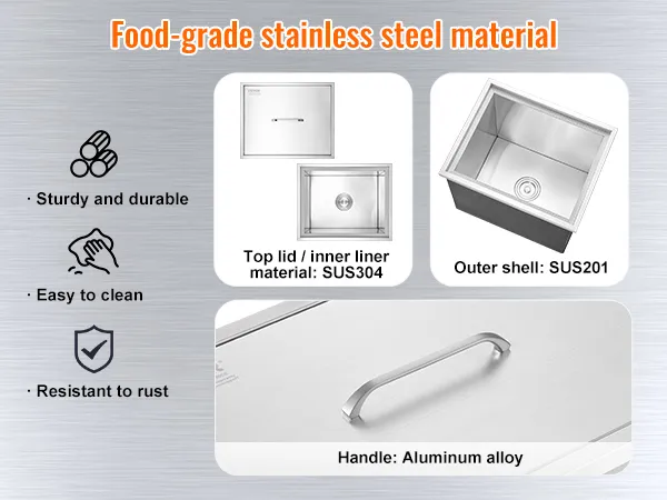 Ta skrzynia na lód jest zbudowana, aby przetrwać. Górna pokrywa SUS304 i wewnętrzna wyściółka zapewniają trwałość i łatwe czyszczenie. Zewnętrzna powłoka wykonana z SSU201 zapewnia dodatkową wytrzymałość. Taka konstrukcja sprawia, że jest odporna na rdzę i zużycie. Idealnie nadaje się do użytku na zewnątrz, gdzie może być narażona na działanie żywiołów. Uchwyt ze stopu aluminium jest zarówno stylowy, jak i funkcjonalny. Ta skrzynia na lód została zaprojektowana tak, aby wytrzymać intensywne użytkowanie w warunkach komercyjnych. Możesz mieć pewność, że z czasem zachowa swoją jakość. Dzięki solidnej konstrukcji pozostaje niezawodną częścią Twojego wyposażenia zewnętrznego przez lata.