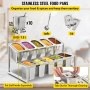 Stalowy stojak na przyprawy VEVOR zawiera wszystko, czego potrzebujesz. Zawiera 10 pojemników na żywność, każdy z pokrywką i chochlą. Pojemniki 1/9 są wykonane ze stali nierdzewnej 304. Te spodnie są higieniczne i trwałe. Te pojemniki mają wymiary 6,9 x 4,3 x 4,11 cala. Ten kompleksowy zestaw idealnie pasuje zarówno do dużych, jak i małych pojemników. Ułatwia to przechowywanie i organizowanie kuchennych przedmiotów. Każdy pojemnik i chochla są zaprojektowane tak, aby idealnie pasowały do stojaka, zapewniając estetyczny i uporządkowany wygląd.