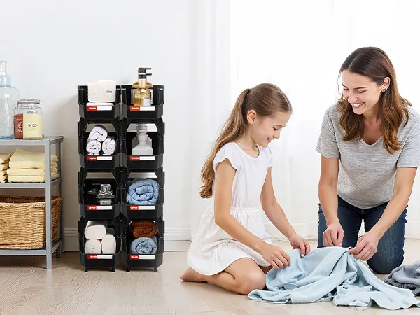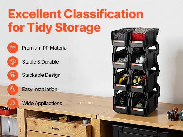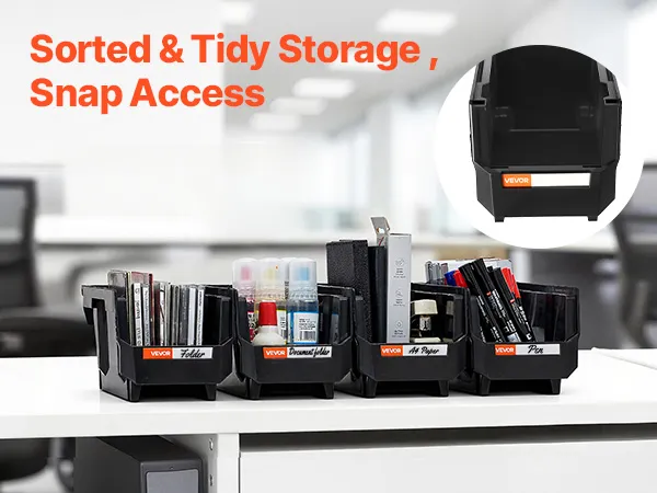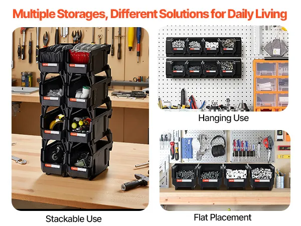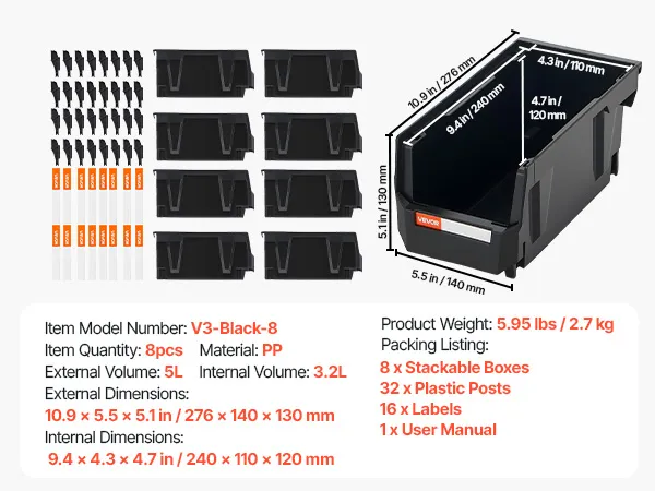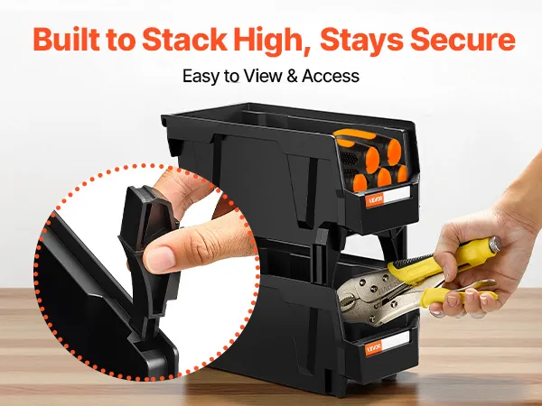 Pudełka do układania w stosy VEVOR, 276 x 140 x 130 mm (opakowanie 8 szt.), Przezroczyste pudełka do przechowywania, Pudełka do przechowywania, Przezroczyste pudełko do przechowywania do organizowania i przechowywania małych części, artykułów biurowych i innych akcesoriów, Czarne