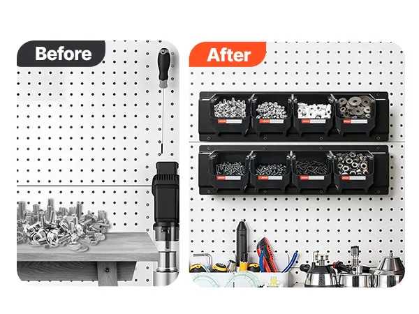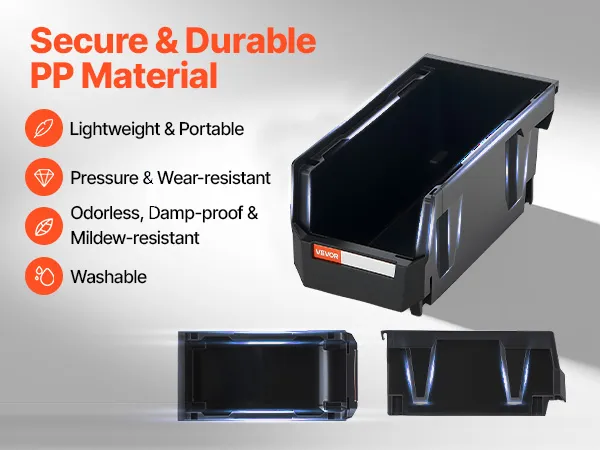 Trwałe i praktyczne: Wykonane z wytrzymałego, łatwego w czyszczeniu tworzywa PP ze wzmocnionymi wspornikami kolumnowymi, te pojemniki do przechowywania w garażu można układać w stosy, wieszać lub kłaść płasko. Nie chwieją się, nie pękają i są w pełni wielokrotnego użytku.