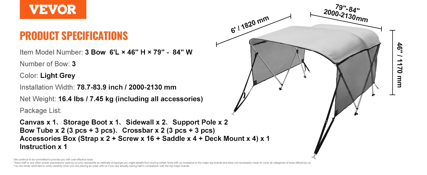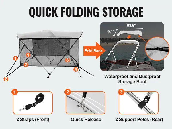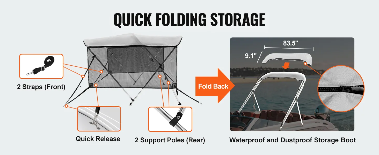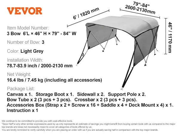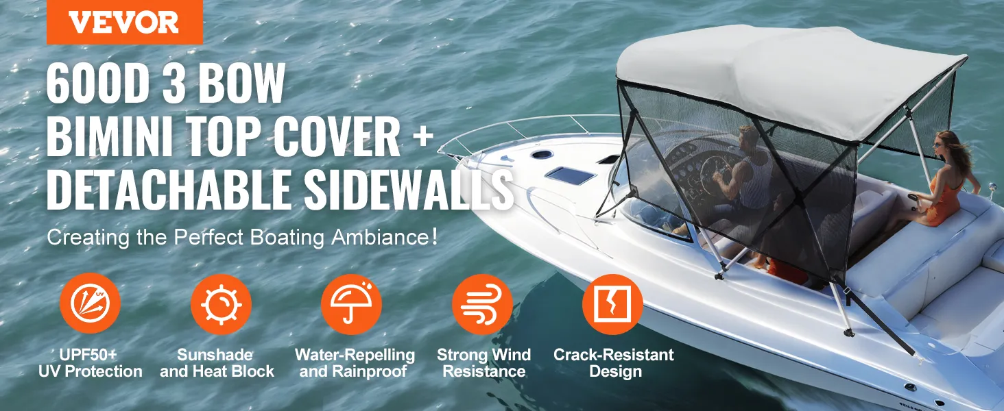 Montaż pokrowca na łódź VEVOR z boczną ścianką jest bardzo prosty. W zestawie znajduje się bagażnik, dwa drążki podporowe i dwa paski. Te akcesoria ułatwiają montaż i przechowywanie. Przejrzyste, łatwe do wykonania instrukcje pomagają szybko go ustawić. Po zamontowaniu idealnie przylega do łodzi. Akcesoria sprawiają, że przechowywanie dachu, gdy nie jest używany, jest równie proste. Ten bimini top został zaprojektowany tak, aby uprościć Twoje doświadczenie żeglarskie. Dzięki łatwej instalacji i możliwości przechowywania możesz spędzić więcej czasu na korzystaniu ze swojego skutera wodnego!