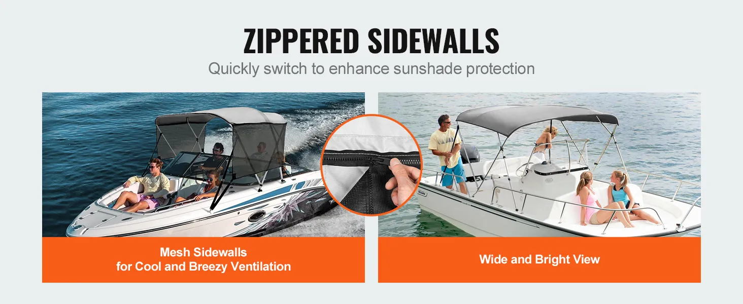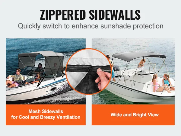 Ten bimini top z poliestru 600D jest wyposażony w odpinane ścianki boczne z siatki. Te ścianki boczne zapewniają dodatkową warstwę ochrony przed żywiołami. Oferują cień i blokują wiatr, dzięki czemu żeglowanie jest bardziej komfortowe. Siatkowa konstrukcja poprawia również wentylację. Możesz łatwo przymocować i odłączyć ścianki boczne w razie potrzeby. Ta cecha sprawia, że jest wszechstronny i praktyczny w różnych warunkach pogodowych. Dzięki odpinanym ściankom bocznym z siatki możesz dostosować swoje pokrycie w razie potrzeby. Zapewnia zwiększoną ochronę bez uszczerbku dla komfortu.