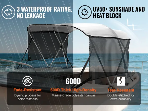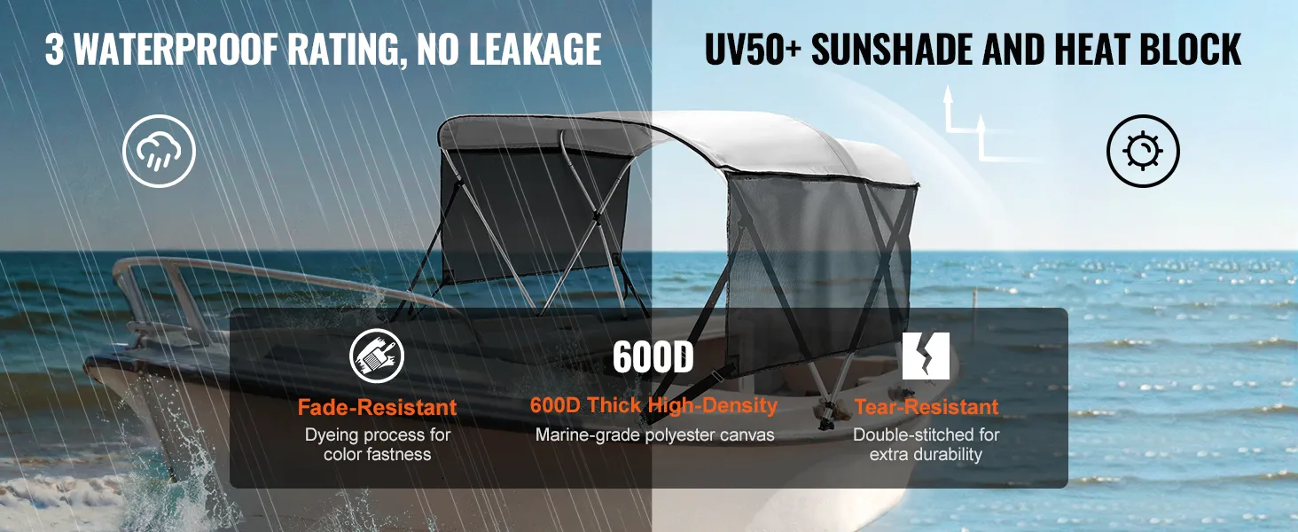 Ten baldachim z poliestru 600D zapewnia lepszy cień i ochronę przed promieniowaniem UV. Posiada współczynnik ochrony UV 50+, blokując szkodliwe promienie. Ta cecha jest ważna podczas długich dni na wodzie! Baldachim został zaprojektowany tak, aby wytrzymać ekspozycję na słońce bez blaknięcia. Zapewnia odpowiedni cień i ochronę. Wytrzymała tkanina zapewnia dobrą ochronę przed żywiołami. Dzięki temu bimini top zyskujesz niezawodną ochronę przed słońcem. Możesz cieszyć się spędzaniem czasu na wodzie z tym produktem.