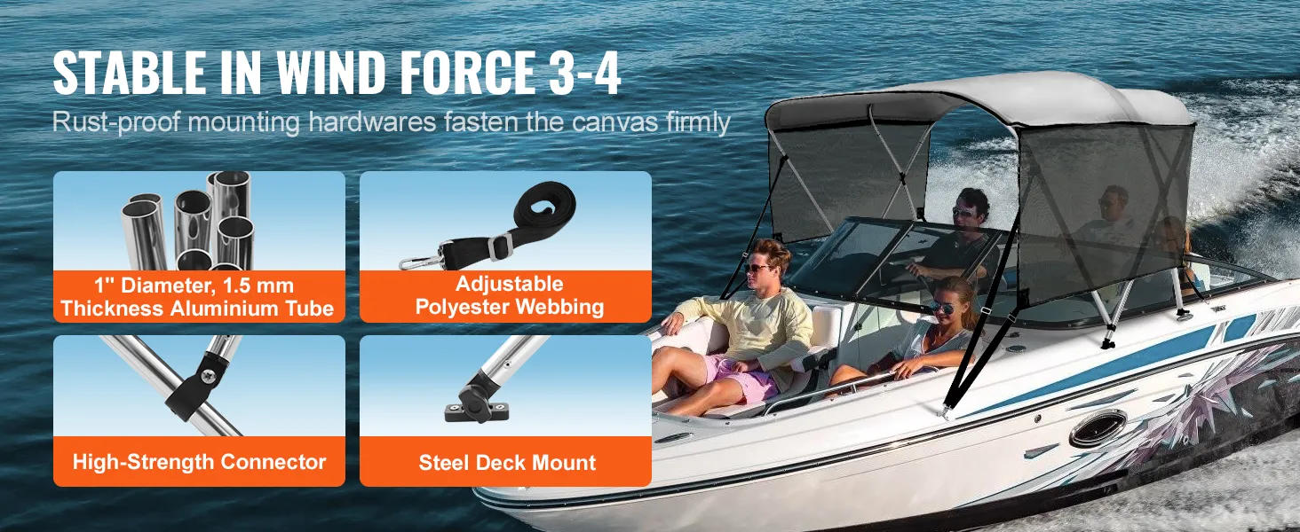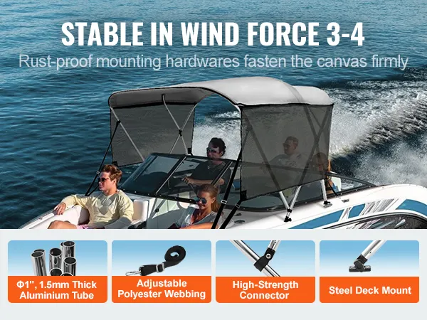 Ten trzyczęściowy bimini top oferuje solidną konstrukcję, która zapewnia długotrwałe użytkowanie. Posiada baldachim z poliestru 600D, znany ze swojej trwałości. 1-calowa rama ze stopu aluminium zapewnia wytrzymałość bez dodawania dużej wagi. Ta konstrukcja sprawia, że jest on wytrzymały i idealny do długotrwałego użytkowania. Dzięki temu bimini top otrzymujesz odpowiednią osłonę, która dobrze znosi warunki atmosferyczne. Ma on zapewniać niezawodny cień i ochronę przez wiele sezonów żeglarskich. Trwałe materiały użyte w jego konstrukcji zapewniają, że wytrzyma on próbę czasu.