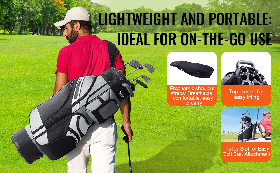 Torba na wózek golfowy VEVOR jest wszechstronna i praktyczna. Ma wiele podzielonych przegródek. Konstrukcja tych przegródek umożliwia im pomieszczenie całego zestawu kijów golfowych. Każdy kij ma własną dedykowaną przestrzeń, dzięki czemu idealnie do siebie pasują. Taka konstrukcja ułatwia znajdowanie i odzyskiwanie kijów podczas gry. Ponadto podzielone sekcje pomagają zapobiegać splątaniu kijów. Jedna z najbardziej przydatnych funkcji jest szczególnie przydatna dla golfistów, którzy noszą w torbie dodatkowe lub pełnowymiarowe kije. Ciesz się higieniczną rundą golfa z tą wszechstronną torbą na wózek.