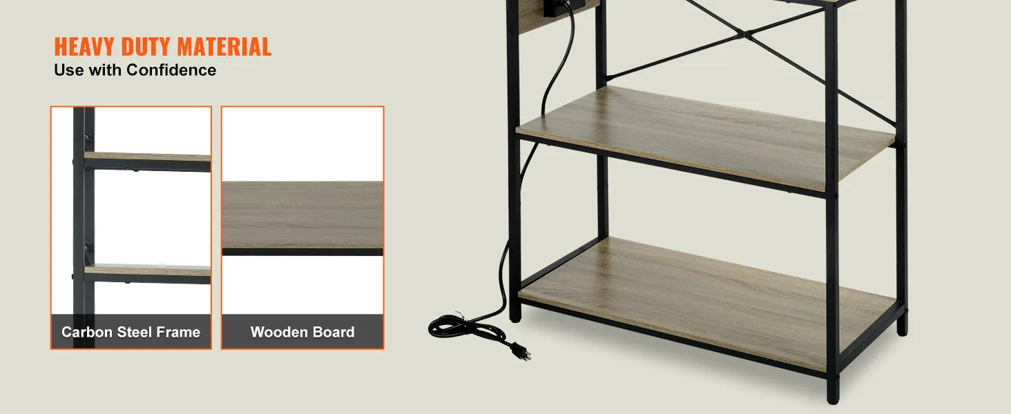 Stalowa rama i drewniana płyta tworzą solidną podstawę. Może pomieścić wszelkiego rodzaju butelki na przyprawy, kuchenki mikrofalowe, wino, zastawę stołową itp.