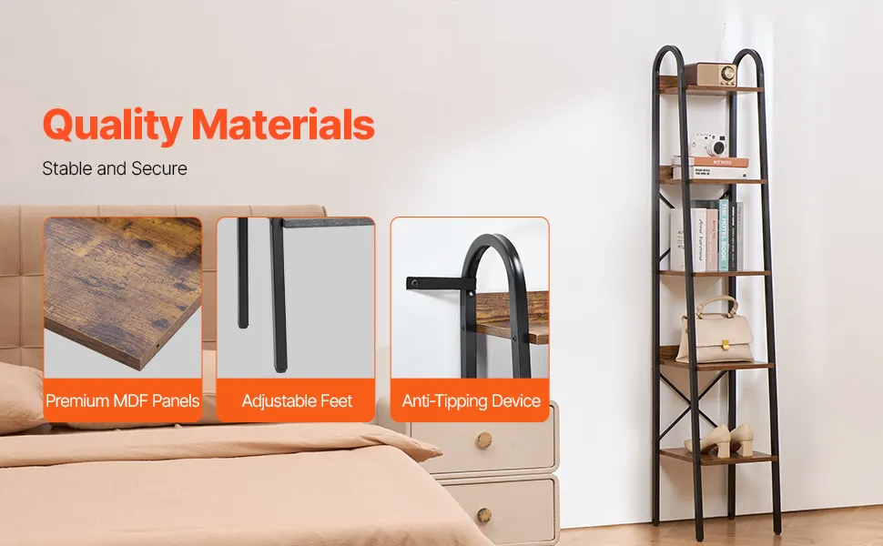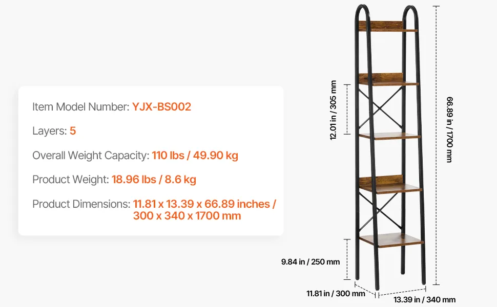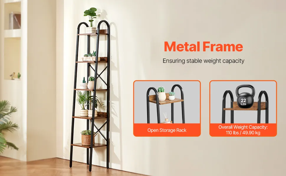 VEVOR Metalowy regał na książki, 5-poziomowy regał trapezowy w stylu industrialnym, mały regał w stylu vintage z otwartymi półkami, wolnostojący regał ekspozycyjny, do biura