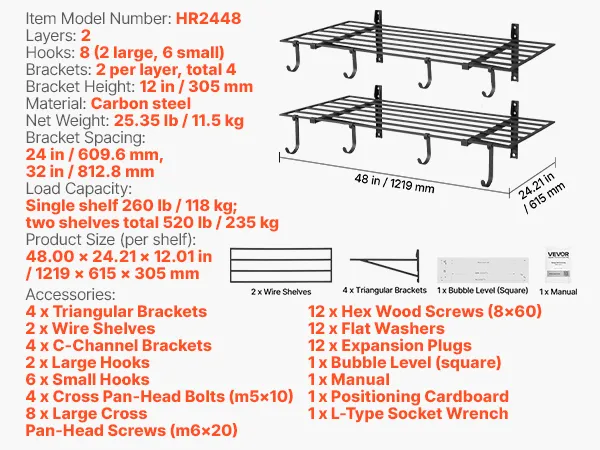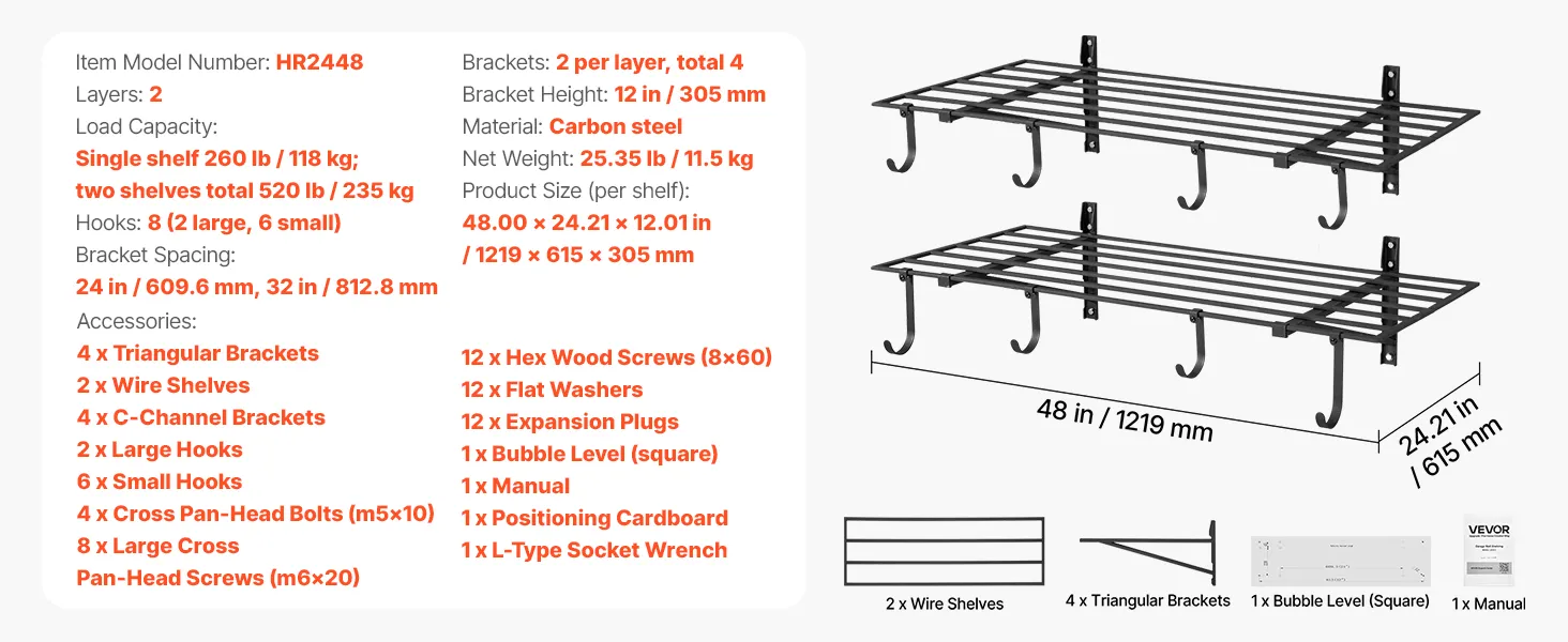 Zestaw półek garażowych VEVOR, 2 części, 1219 x 615 x 305 mm, przechowywanie narzędzi, 118 kg na warstwę, uchwyt ścienny na narzędzia z haczykami, przestrzeń półkowa 1219 x 615 mm, półki do przechowywania, półka metalowa, organizer na narzędzia, półki ścienne
