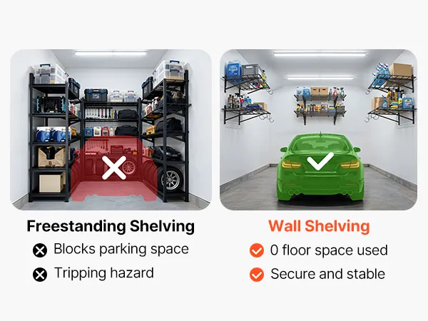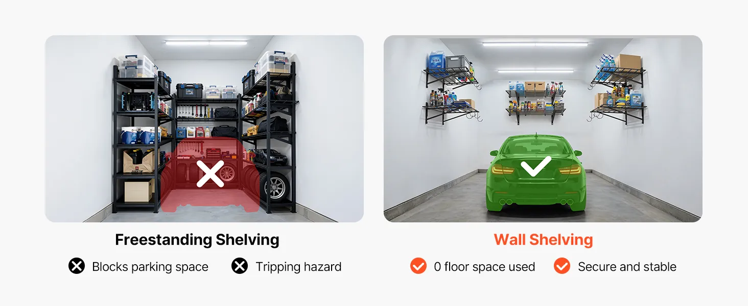 Te wiszące półki garażowe przesuwają przestrzeń do przechowywania z podłogi na ścianę. Twój garaż od razu wydaje się bardziej otwarty, uporządkowany i dostępny, a bałagan w końcu znika.