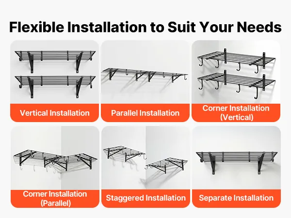 Dodatkowa przestrzeń do przechowywania: Ten zestaw wiszących półek garażowych zawiera 2 duże i 6 małych haczyków. Na haczykach można zawiesić rowery, węże ogrodowe, torby i wiele innych rzeczy, zwalniając miejsce na ścianach i utrzymując podłogę w czystości.