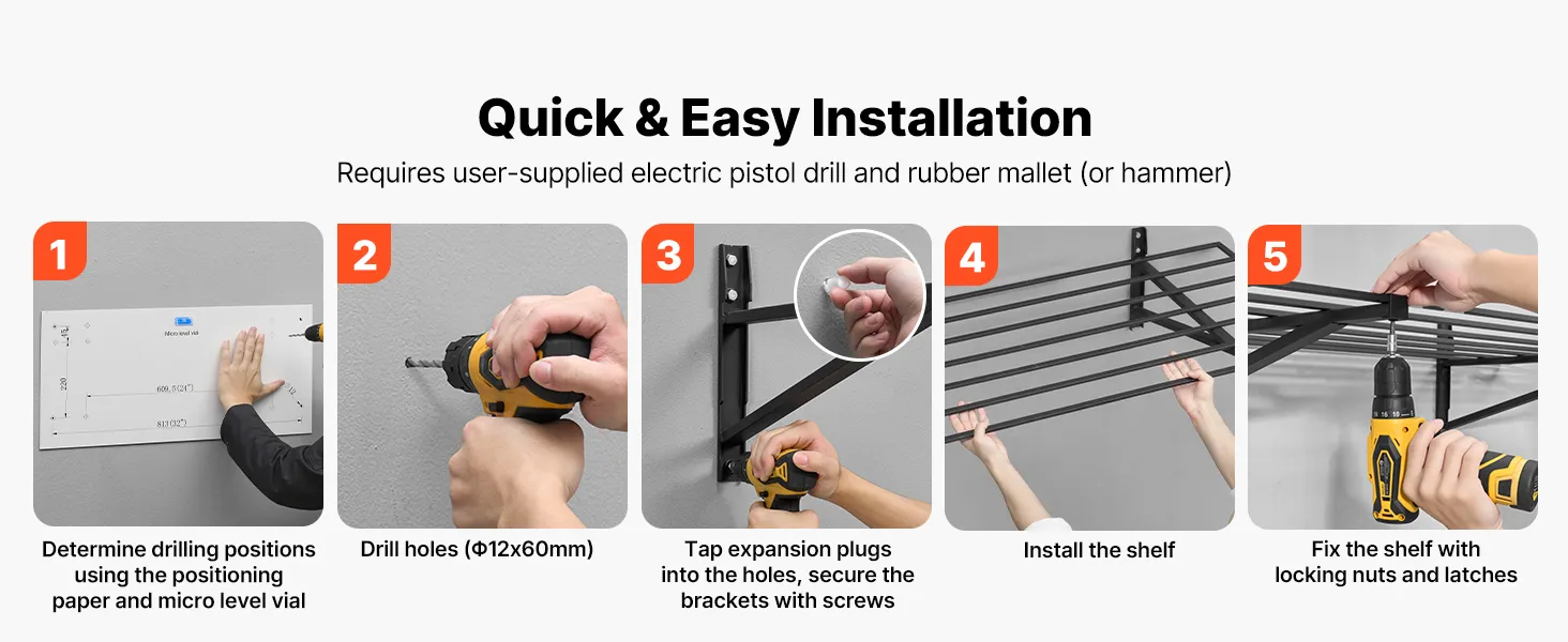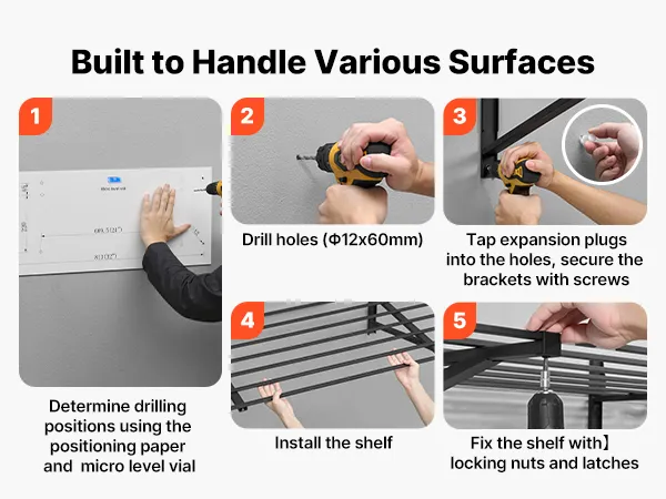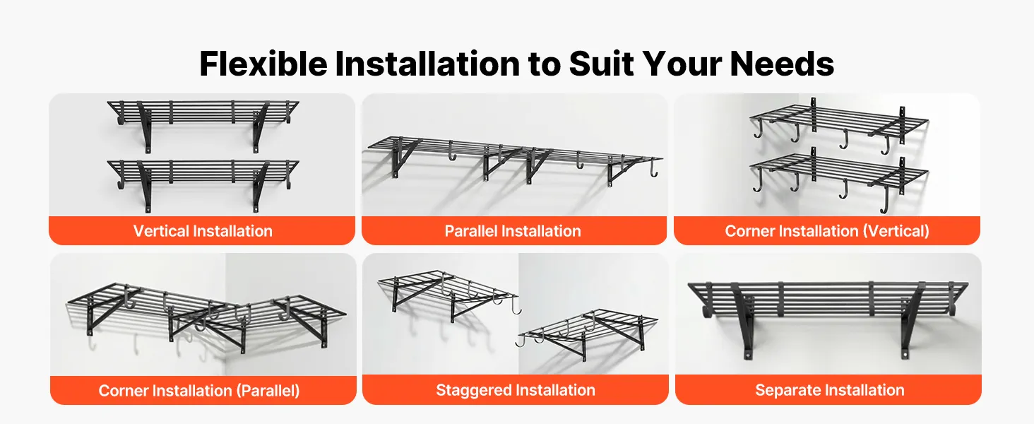 Te montowane na ścianie półki można dopasować do różnych układów pomieszczeń dzięki regulowanemu rozstawowi wsporników wynoszącemu 609,6 mm (24 cale) lub 812,8 mm (32 cale). Można je bezpiecznie zamontować na ścianach betonowych, ceglanych lub drewnianych, dzięki czemu nadają się do wielu różnych przestrzeni.