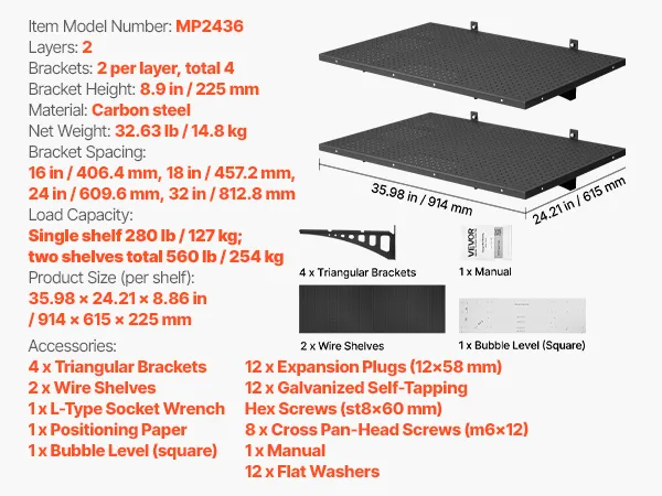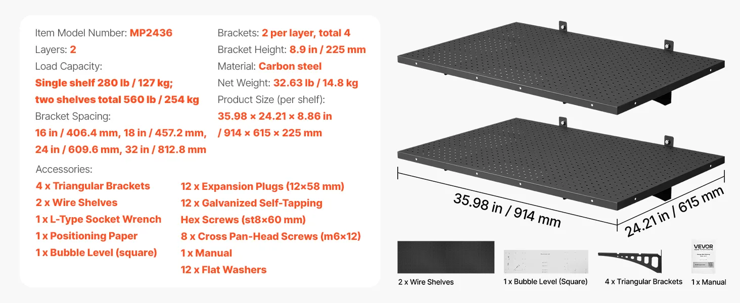Zestaw regałów garażowych VEVOR 2-częściowy, 914x615x225 mm, przechowywanie narzędzi, 127 kg na warstwę, uchwyt na narzędzia, ścienny, 914x615 mm, półka, półki do przechowywania powierzchni, półka metalowa, organizer na narzędzia, półki ścienne