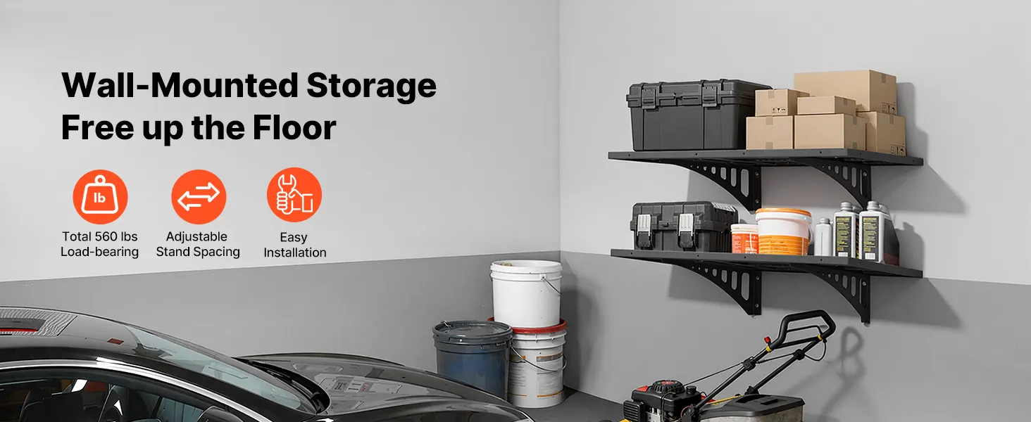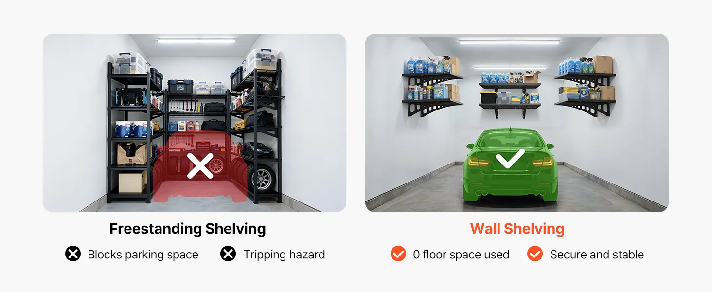 Te wiszące półki garażowe przesuwają przestrzeń do przechowywania z podłogi na ścianę. Twój garaż od razu wydaje się bardziej otwarty, uporządkowany i dostępny, a bałagan w końcu znika.